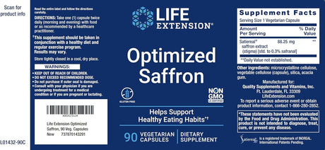 Life Extension Optimized Saffron Extract with Satiereal, 90 Veg Caps - 88.25 Mg