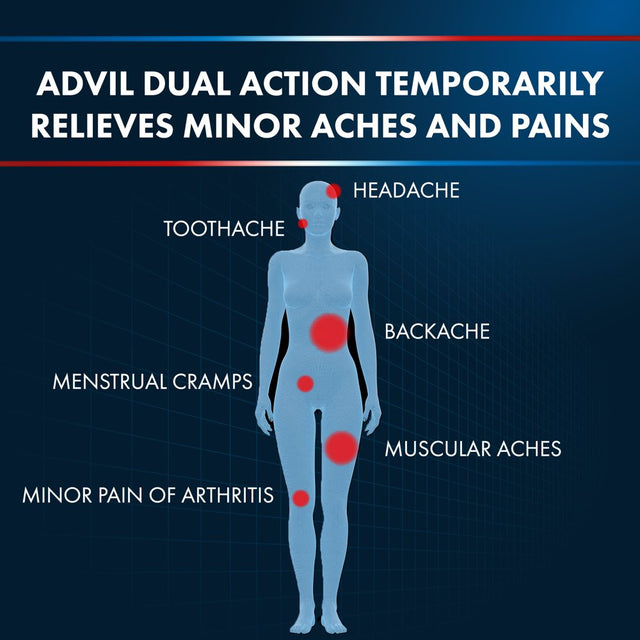 Advil Dual Action Coated Caplets with Acetaminophen are the first and only FDA approved pain relief medication that combines the top two selling pain fighting ingredients for powerful results. Formulated with 250 mg ibuprofen that targets pain at the source and 500 mg acetaminophen that blocks pain signals in each dose, these coated pain relief pills provide relief from a wide variety of aches and pains. This pain medicine provides headache, toothache, menstrual cramp, muscle pain and lower back pain relief while also relieving minor aches and pains associated with arthritis. The combination of ibuprofen and acetaminophen in these Advil caplets allows you to take a lower maximum daily dose of each pain medication and still have powerful, 8 hour relief. Advil is a top selling OTC pain reliever, providing safe and effective pain relief when used as directed for more than 35 years.