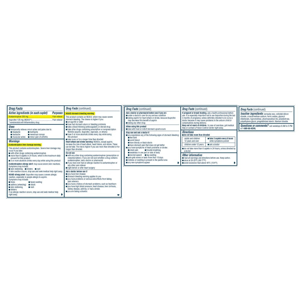 - 144 Advil Dual Action Coated Caplets with Acetaminophen, 250 Mg Ibuprofen and 500 Mg Acetaminophen Per Dose (2 Dose Equivalent) for 8 Hour Pain Relief