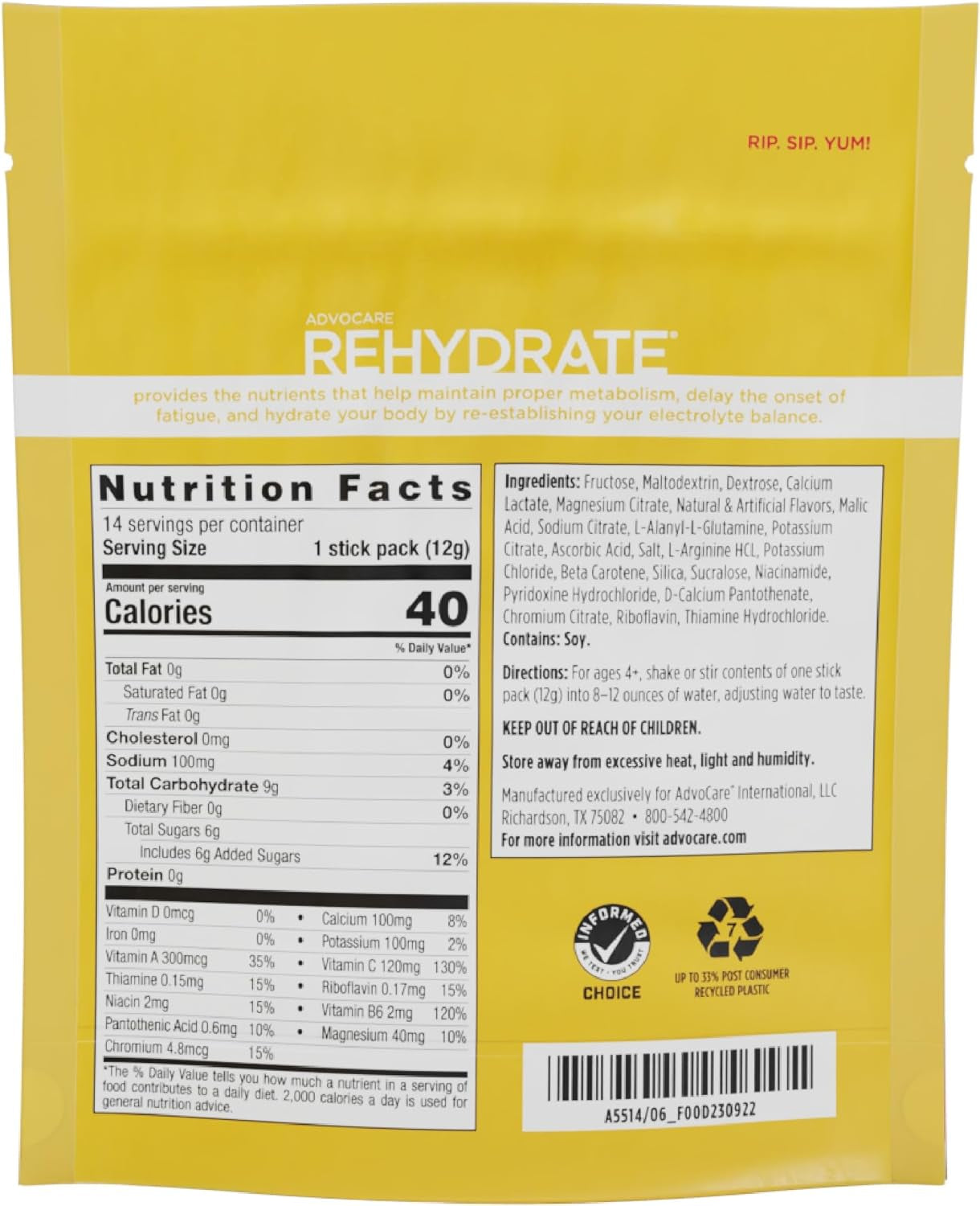 Rehydrate, replenish & recover with a blend of vitamins, minerals and four key electrolytes for everyday hydration. AdvoCare Rehydrate is a great-tasting supplement with 40 calories per serving and a 1:1 sodium to potassium ratio for optimal hydration and taste.
