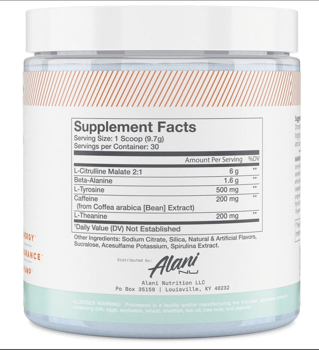 - INCREASE PERFORMANCE: Take 20-30 minutes before your workout for sustained energy and endurance to help achieve your fitness goals. Alani Nu Preworkout contains essential amino acids like L-Theanine to prevent you from crashing, Citrulline to improve the amount of oxygen in your muscle tissue, provides enzymes crucial to cardiovascular health, and beta alanine to regulate lactic acid accumulation in muscles.