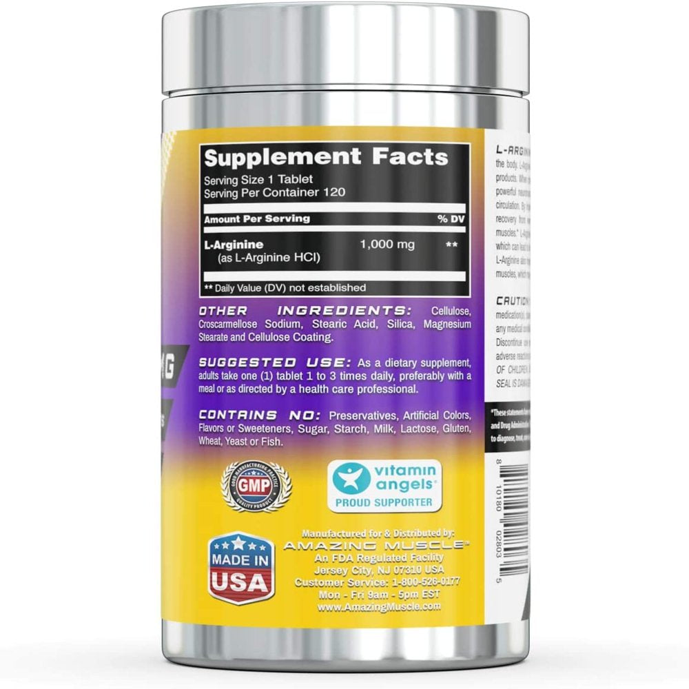 Amazing Muscle L-Arginine 1000Mg Supplement - Best Amino Acid Arginine HCL Supplements for Women & Man - Promotes Circulation and Supports Cardiovascular Health - 120 Tablets