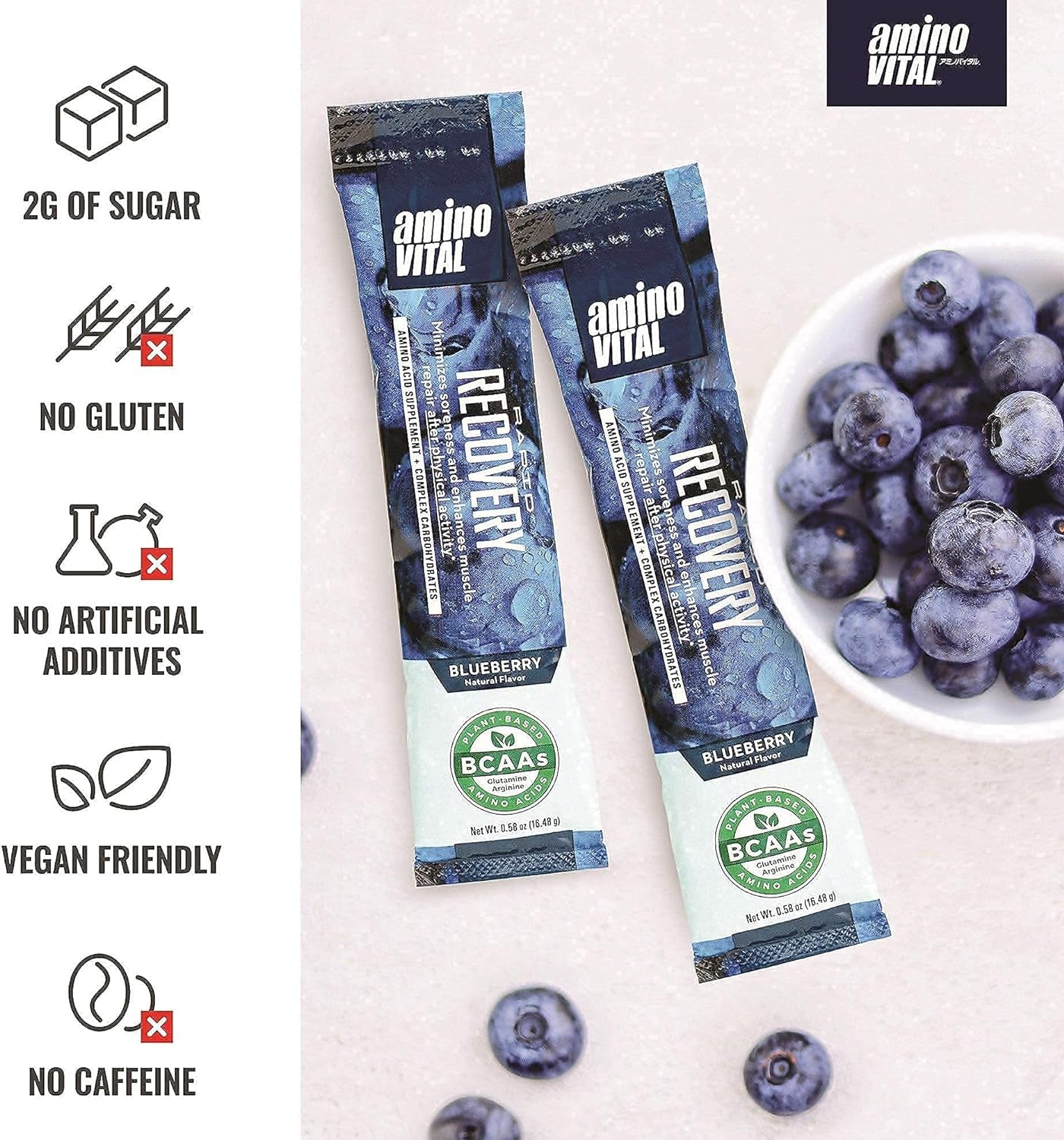 • Our BCAA + electrolyte blend is packaged in single serve stick packs for on-the-go fuel.