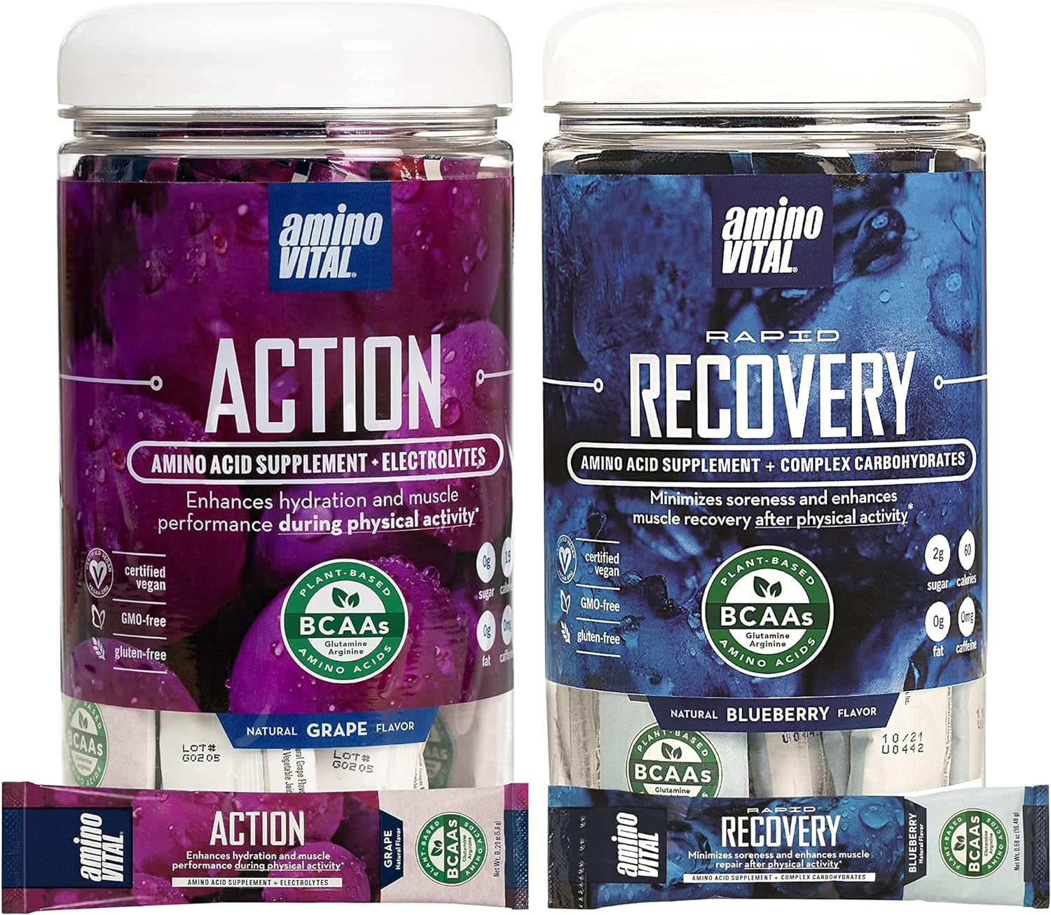 Amino Vital Action & Rapid Recovery- BCAA Amino Acids Pre and Post Workout Packets | No Caffeine, Vegan, Gluten Free | 14 Single Serve Stick Pack | Grape and Blueberry Flavor
