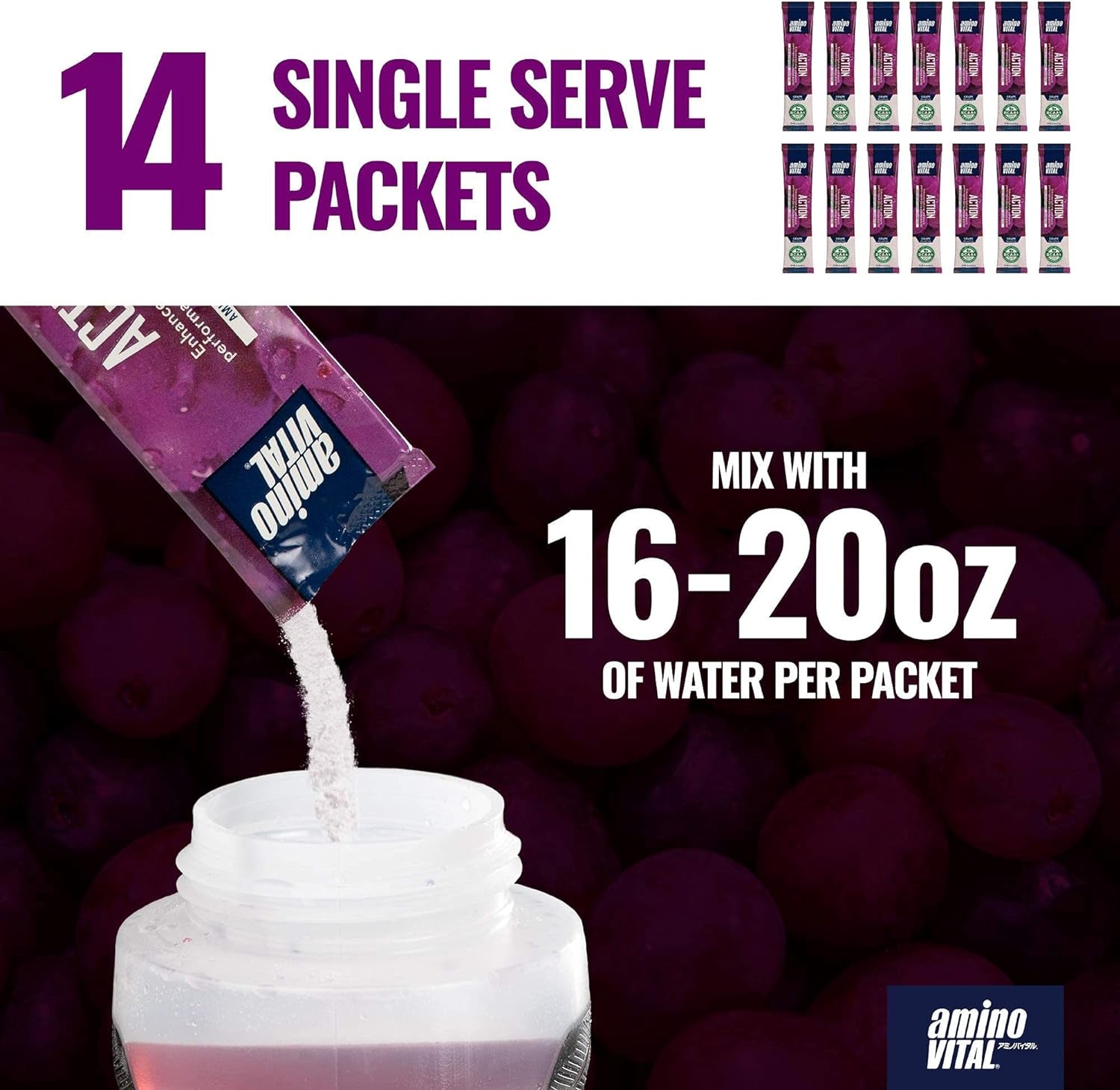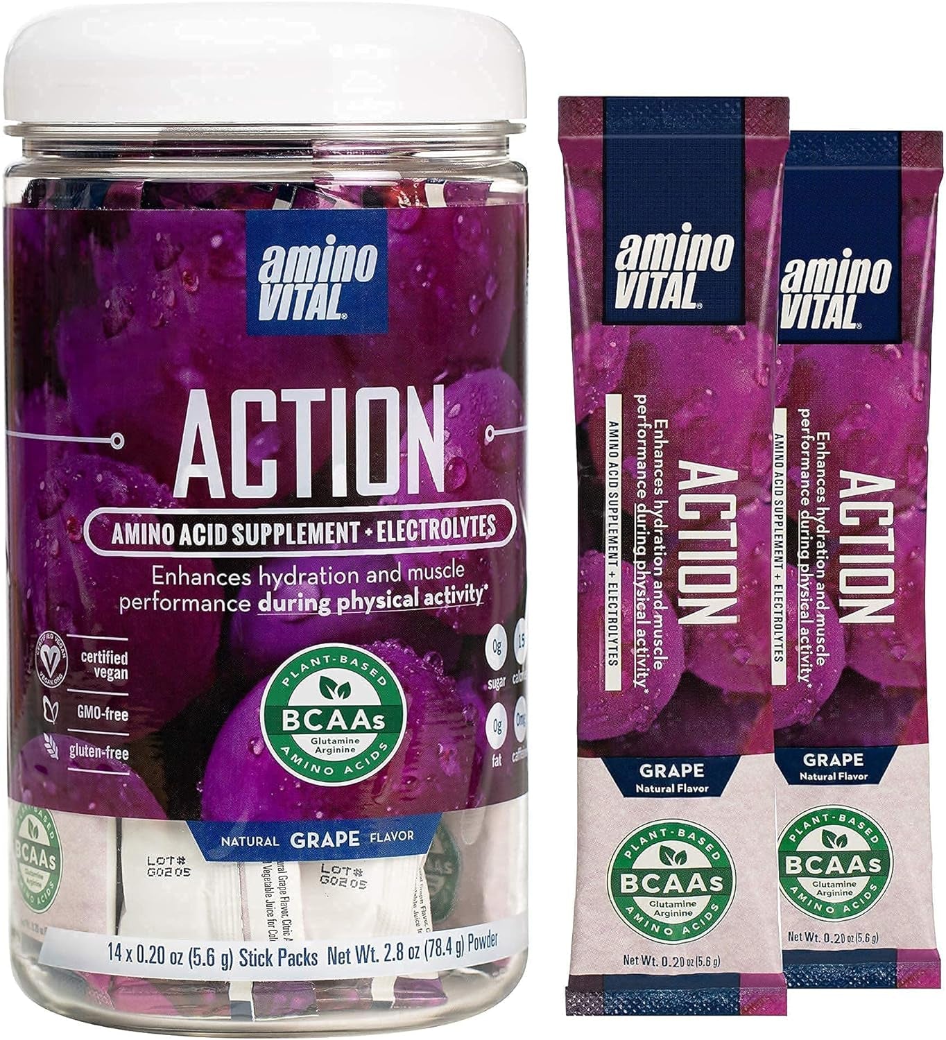 - ACTION: KETO FRIENDLY SPORTS NUTRITION – These single serve bcaa packets comes in grape or lemon flavors that dissolve quickly in water and contain no artificial dyes or sweeteners. amino VITAL Action is only 15 calories, no sugar and 1g of carbs making it a keto friendly choice.