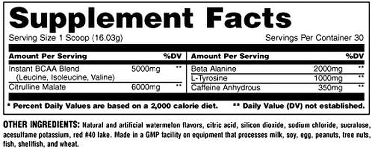 • 5g BCAA, 6g Citrulline Malate, 2g Beta Alanine, 1g L-Tyrosine, 350mg Caffeine. Combined for a powerful preworkout energy drink suplement. Each container contains 30 servings.