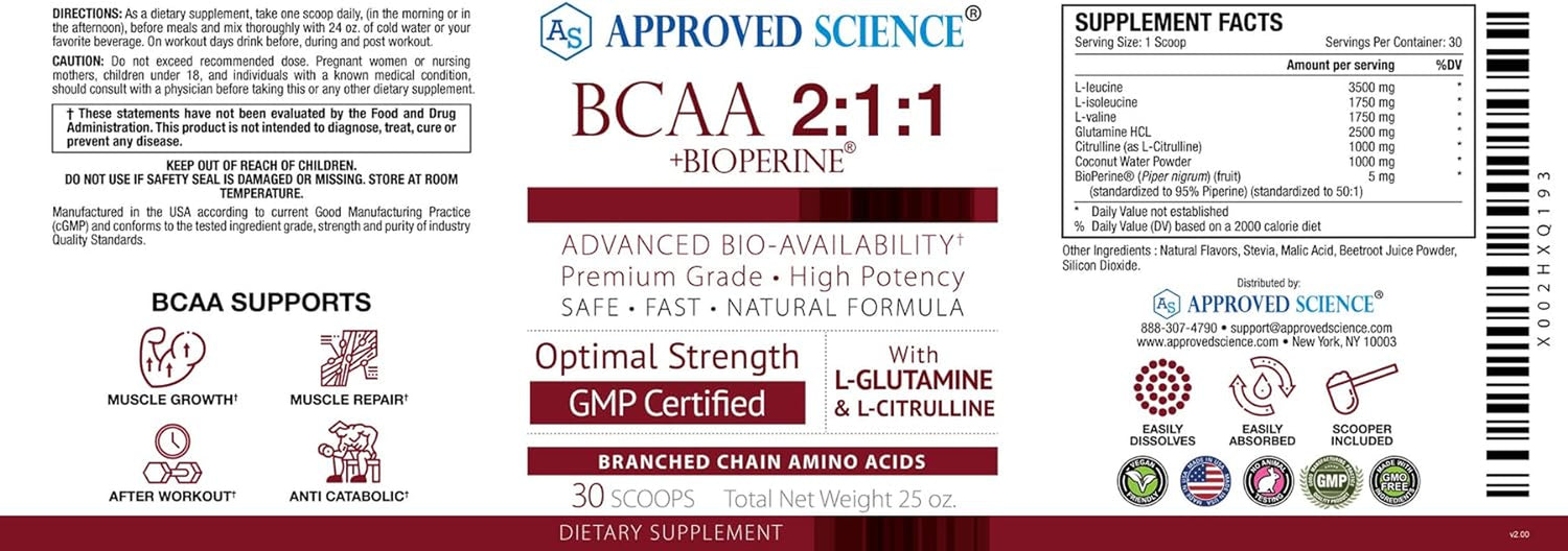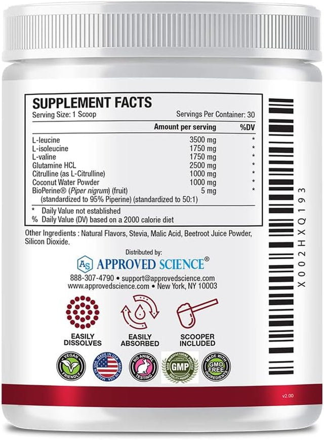 Approved Science® BCAA Powder - 2:1:1 BCAA Ratio - 3500 Mg L-Leucine - Fruit Punch Flavor - 25 Ounce - 30 Servings - Workout Boost, Endurance, Prevent Burnout - Bioperine - Vegan Friendly - 1 Tub - 1 is backordered and will ship as soon as it is back in stock.