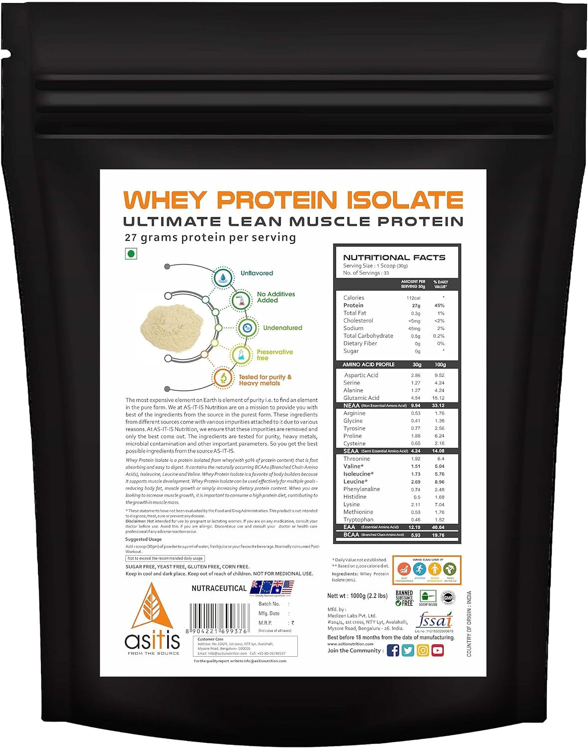 AS-IT-IS Nutrition Whey Protein Isolate 90% - 1 Kg/35.2 Oz | Protein 27G & Bcaa 5.9G per Serving Rich in Branched Chain Amino Acids Leucine, Isoleucine and Valine