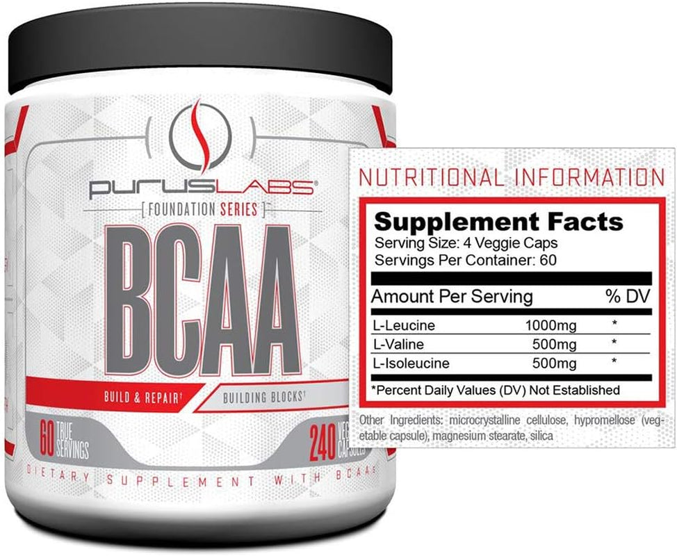 BCAA Capsules by Purus Labs Foundation Series | 2:1:1 Leucine, Valine, Isoleucine | for Recovery, Endurance, Strength and Muscle Building | 240 Capsules (60 Servings)