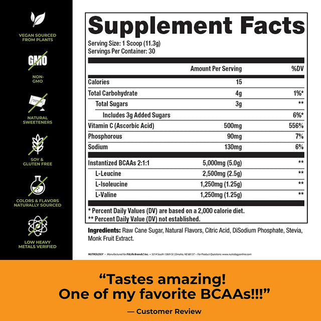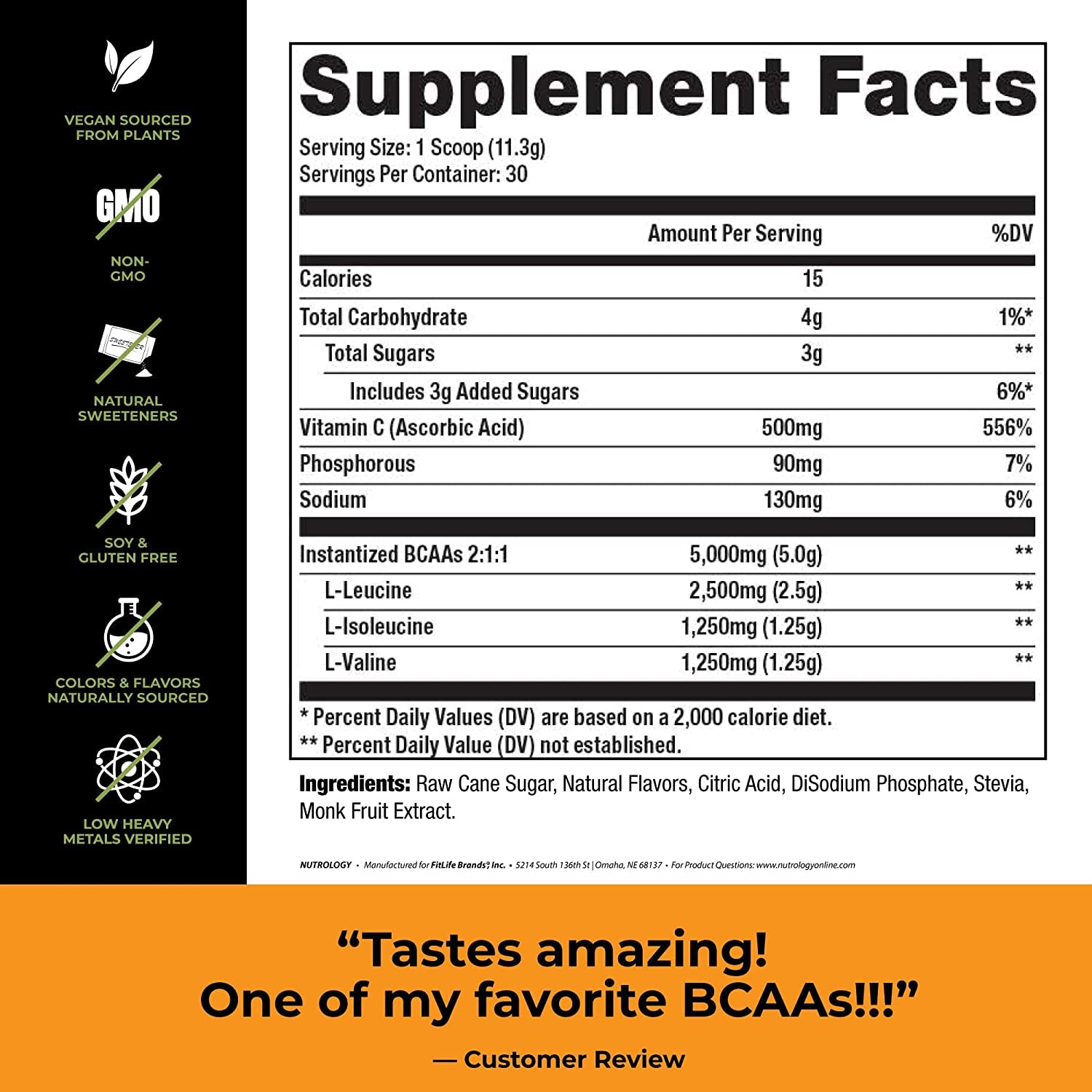 • Full Transparency: Nutrology BCAA Natural offers vegan amino acids derived from Non-GMO corn sourced from trusted farms, produced with-out added allergens for the highest quality plant based BCAA powder that is soy-free, gluten-free, free of artificial colors or flavors. Includes 30 servings with 5g of BCAAs per serving.