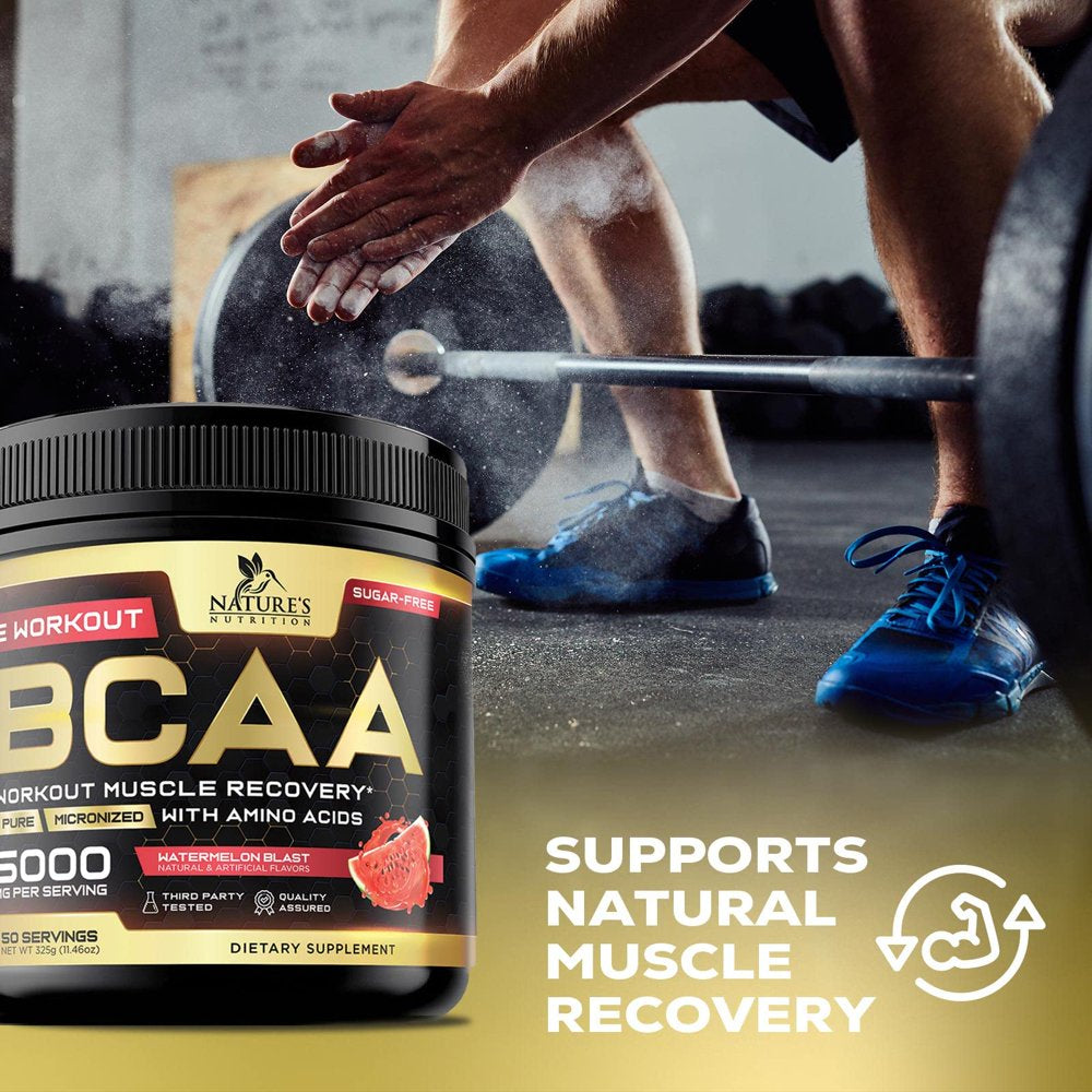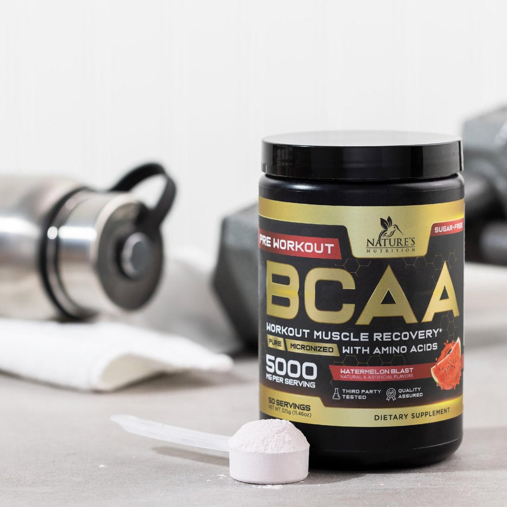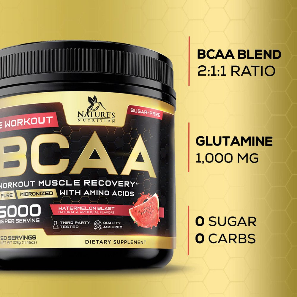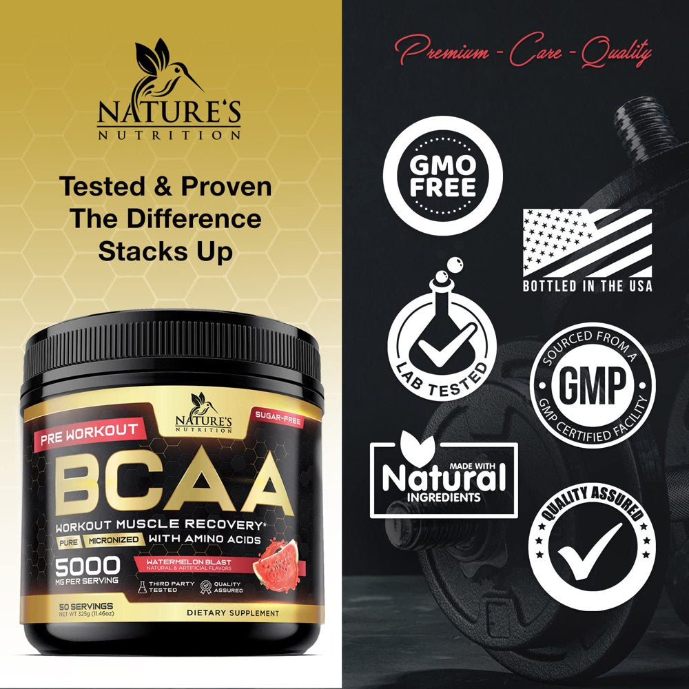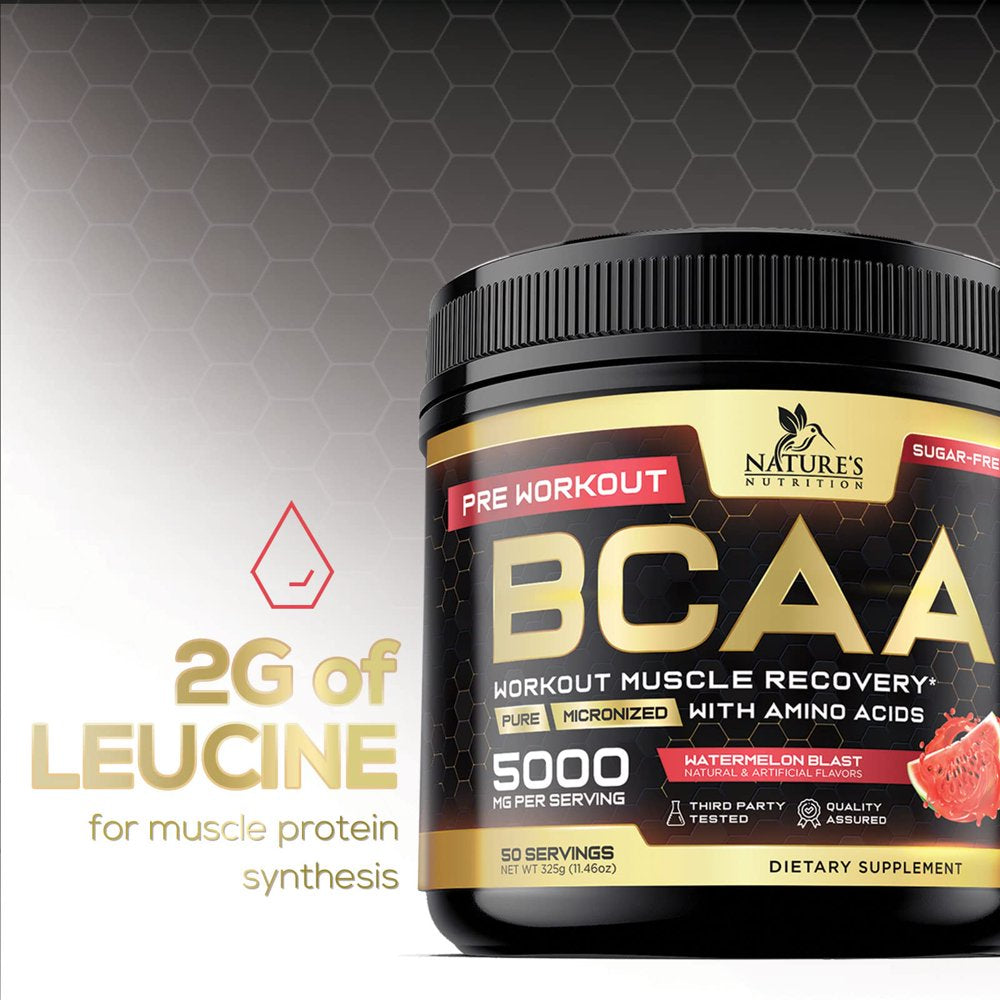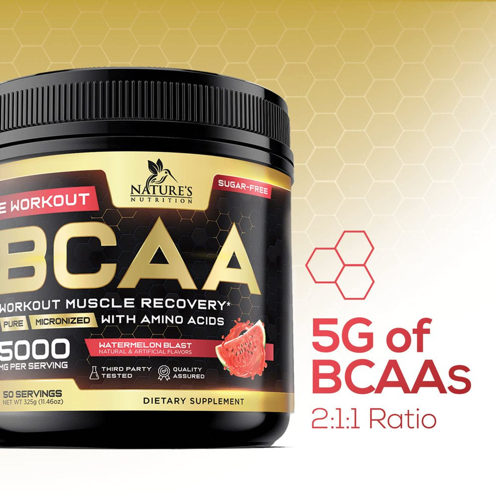 • Natures Nutrition BCAA Powder 211 Sugar Free Pre Workout Drink Mix - Watermelon flavored BCAAs 50 Servings; 5000 MG with Glutamine; Branched chain amino acids for men and women, including leucine; Perfect sport bcc aminos acid supplement before, after or intra fitness aminoacidos lean bcca best branch bulk energy hydration support muscle nutrition post original recovery support ripped keto friendly supplements