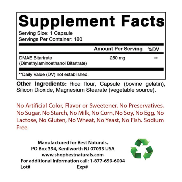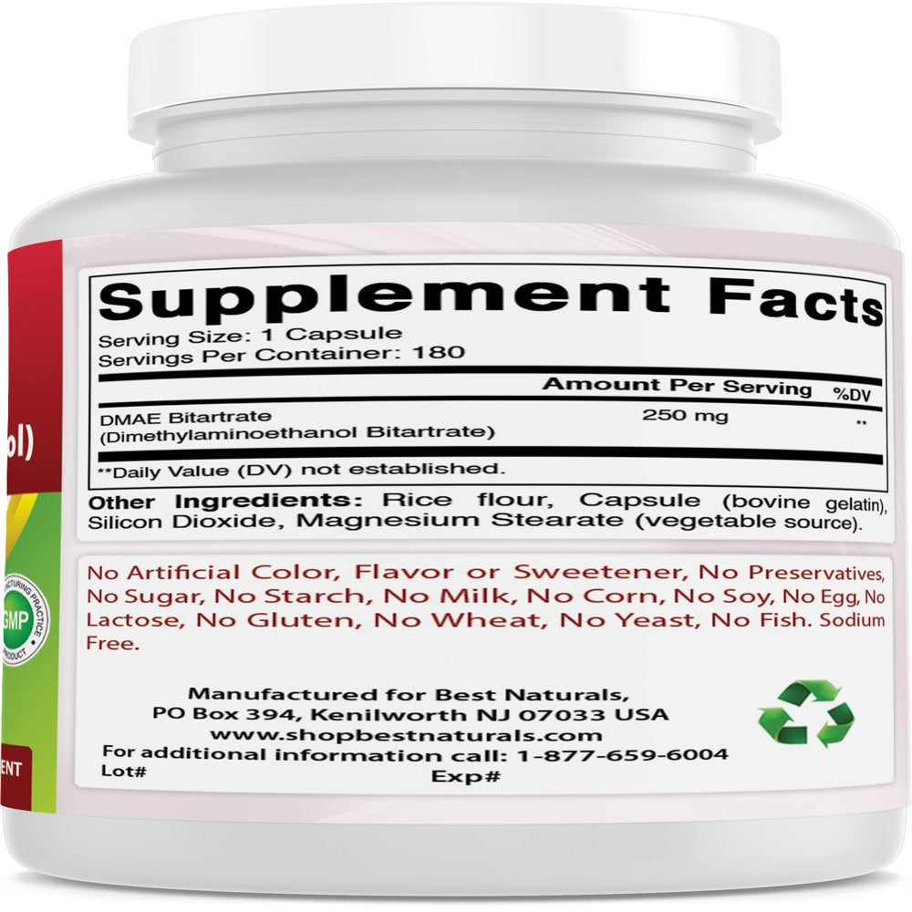 Best Naturals DMAE Supplement 250 Mg 180 Capsules | Dimethylaminoethanol Bitartrate