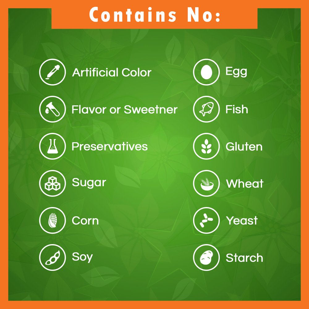 - No Artificial Color, Flavor or Sweetener, No Preservatives, No Sugar, No Milk, No Corn, No Soy, No Egg, No Lactose, No Gluten, No Wheat, No Yeast, No Fish. Sodium Free.