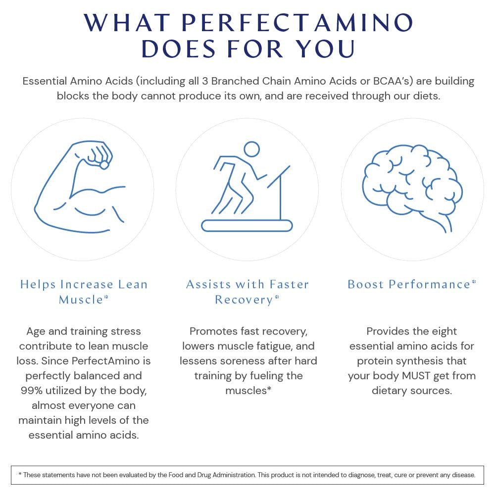 Recover Faster, Increase Lean Muscle, and Boost Performance by Giving Your Body What It Actually Needs Reduce Muscle Recovery Time Whether you are an endurance athlete or a work-out fiend, you definitely spend a lot of time stressing out the body, tearing muscle fibers and wearing out tendons, ligaments and joints. Your body is thereby using amino acids at a high rate to repair, rebuild and recover. Take PerfectAmino with you to the gym or on your bike or run to give yourself a steady stream of what your body NEEDS to make those repairs and build that muscle. Builds & Maintains Lean Muscle Mass Muscle loss is a real problem. As people age, they lose muscle mass because their amino acid levels are too low in their body. It is VITAL to have proper levels of all essential amino acids in their bodies, or risk losing muscle mass at a high rate. Stop muscle loss and increase lean muscle mass with the proprietary blend of PerfectAmino. 99% Utilized for Protein & Collagen- Without the Calories Each 5-gram serving of PerfectAmino (5 tablets) is equivalent to approximately 30 grams of whey, collagen, or soy protein, yet contains only a few calories. Therefore, by replacing 30 grams of this protein with PerfectAmino, you can reduce 120 calories from your daily diet. Read more The Ideal Protein for the Human Body 99% Utilized by the Body to Build New Protein and Collagen PerfectAmino is pure essential amino acids in the exact ratio needed by the human body to make new protein and collagen without added sugar, waste, or calories. PROTEIN PILLS + BCAAs HELP BURN FAT & GAIN MUSCLE Regular PerfectAmino consumption can increase the calories you burn by boosting your metabolic rate and reducing your appetite. 3 of the 8 amino acids are Branched Chain Amino Acids (BCAA) which, in combination with the other 5 also helps build and preserve muscle mass without adding calories! BETTER THAN BCAAs, COLLAGEN & WHEY COMBINED! Don’t listen to the marketing hype surrounding BCAAs, COLLAGEN and WHEY. Here’s why. 1. BCAAs are only 3 of the 8 essential amino acids that the body REQUIRES to build a protein (muscle). Taking lots of BCAAs creates an IMBALANCE of the essential amino acids, which actually causes the body to convert them into carbohydrates and sugars! 2. COLLAGEN is a meat derivative and is missing one key essential amino acid, plus it has the rest of the amino acids in unworkable ratios. Too many of some and not enough of others. Similar to that of meat protein. 3. WHEY is a dairy derivative and has the same utilization as dairy, which is a lowly 16%, meaning almost all of it get WASTED. Yes, wasted. Converted into carbohydrates and sugars and burned up or eliminated with nitrogen waste. Doctor Formulated Dr. Minkoff has worked as an attending physician in infectious disease, co-directed a neo-natal intensive care unit, and worked as an ER physician. In 1997 he founded and is the Medical Director for Lifeworks Wellness Center, now one of the foremost alternative medicine clinics in the US. In addition to seeing hundreds of patients per week, he travels the country as a keynote speaker at numerous medical conferences every year. Not to mention, he is a 43-time Full Ironman Competitor—most recently coming in 3rd place in his age group at Ironman Louisville.