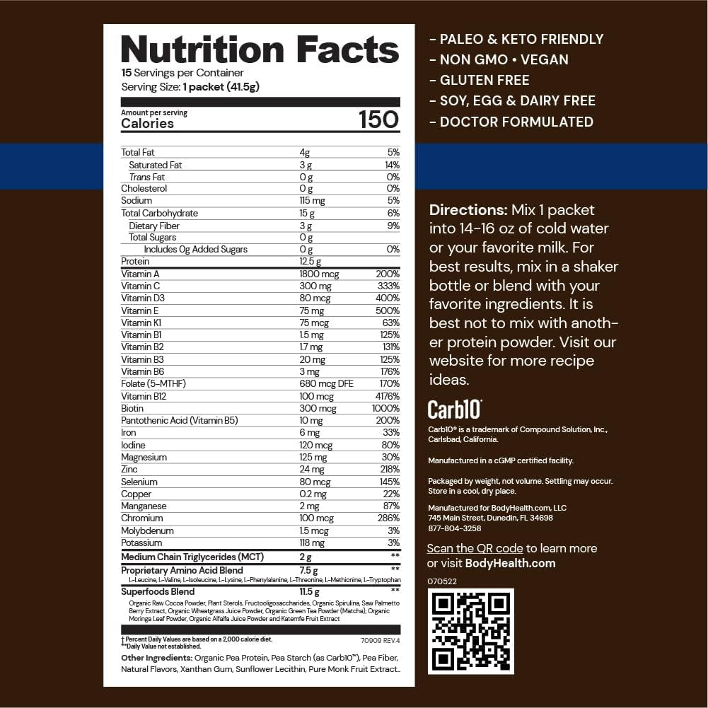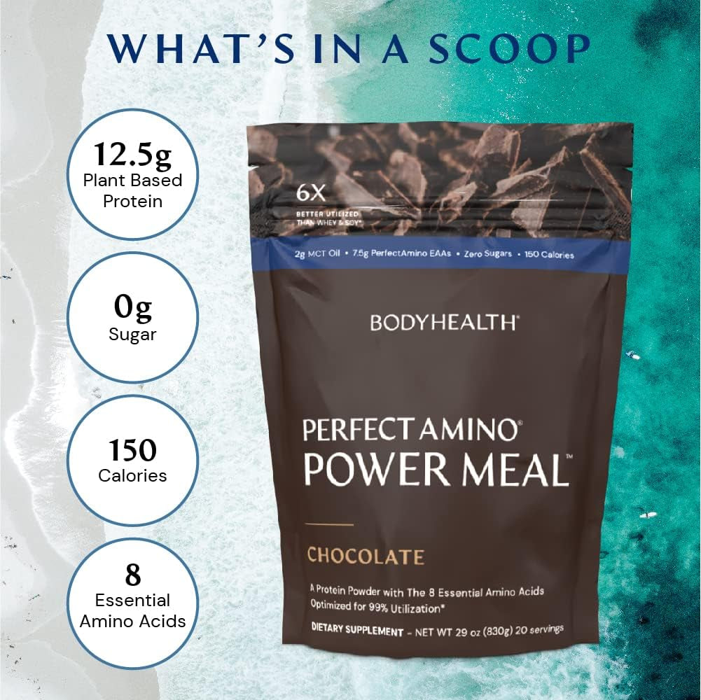 Bodyhealth Perfectamino Power Meal Shake New Dark Chocolate Flavor with MCT Oil Carb 10 and Perfect Amino Protein Base (20 Servings) - Dark Chocolate is backordered and will ship as soon as it is back in stock.