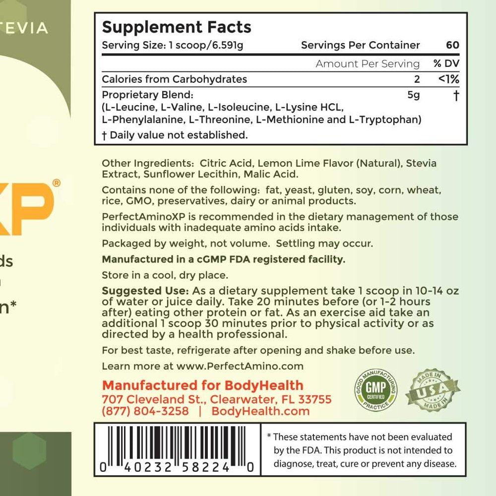 Bodyhealth Perfectamino XP Lemon Lime, Best Pre/Post Workout Recovery Drink, 8 Essential Amino Acids Energy Supplement with 50% Bcaas, 100% Organic, 99% Utilization, 30 Servings is backordered and will ship as soon as it is back in stock.