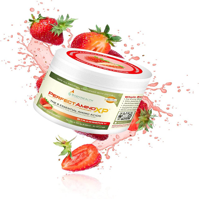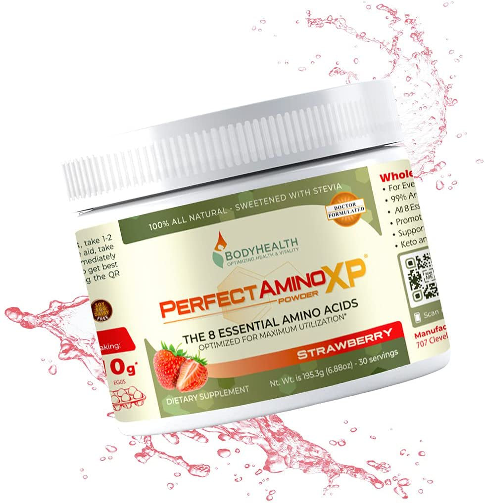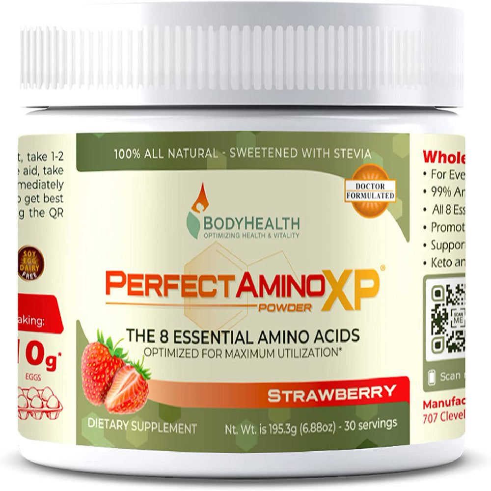 Bodyhealth Perfectamino XP Strawberry (30 Serving) Best Pre/Post Workout Recovery Drink, 8 Essential Amino Acids Energy Supplement with 50% Bcaas, 100% Organic, 99% Utilization