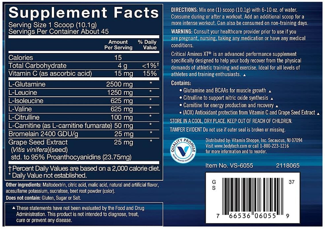 Glutamine and BCAAs for muscle growthCitrulline to support nitric oxide synthesisCarnitine for energy production and recoveryAOX antioxidant protectionStrawberry Lemonade flavor It doesn't matter if you're a seasoned athlete or just starting out on your fitness journey - we could all use a little backup when the going gets tough. Critical Aminos XT by BodyTech provides intra- and post-workout aid with glutamine, BCAAs, citrulline, and carnitine to promote energy production, muscle performance, and recovery. This tasty Strawberry Lemonade-flavored powder also features AOX antioxidant protection with vitamin C and grape seed extract. Frequently Asked Questions What are BCAAs? Branched-chain amino acids(BCAAs) include leucine, isoleucine, and valine. They support muscle growth and reduce muscle fatigue. What is glutamine? Glutamine is an essential amino acid that helps regulate protein synthesis for muscle recovery. What is citrulline? Citrulline is an amino acid involved in the production of nitric oxide, which increases blood flow to working muscles. What is carnitine? Carnitine is an amino acid-like compound that supports exercise recovery.