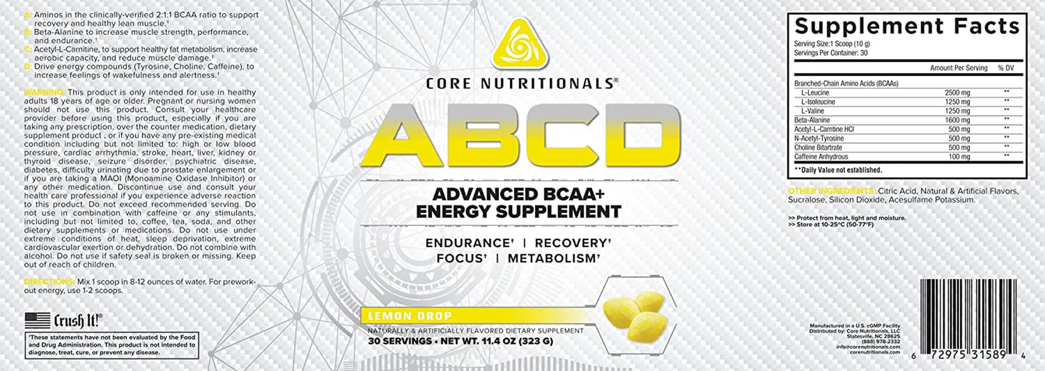 Core Nutritionals Platinum ABCD Advanced BCAA Energy Supplement, Improves Endurance, Recovery, and Focus 30 Servings (Lemon Drop)
