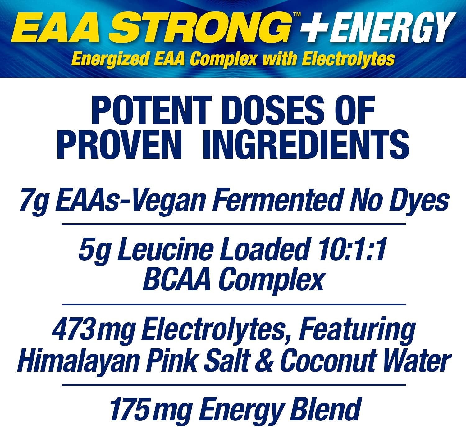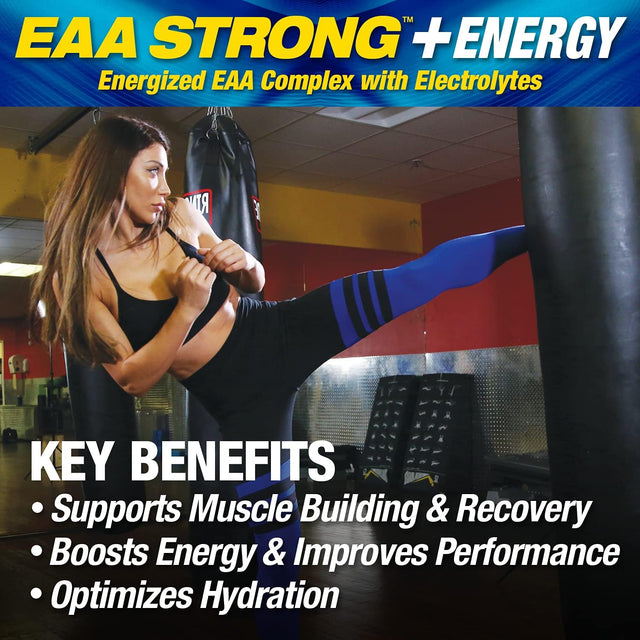 - ENHANCES MUSCLE BUILDING AND RECOVERY: using a potent 10:1:1 BCAA ratio (leucine: isoleucine: valine) EAA STRONG + Energy is packed with Leucine, the key amino acid needed for turning on muscle protein synthesis, which leads to muscle repair, recovery, and growth.*