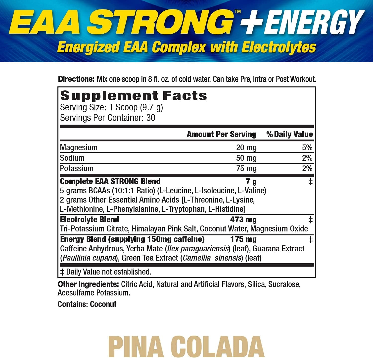 EAA Strong + Energy, Essential Amino Acid Supplement, All 9 Eaas, Bcaas, Electrolytes, Coconut Water, Pre-Workout Enhances Muscle Building, Performance, Recovery, Caffeine, Pina Colada, 30 Servings