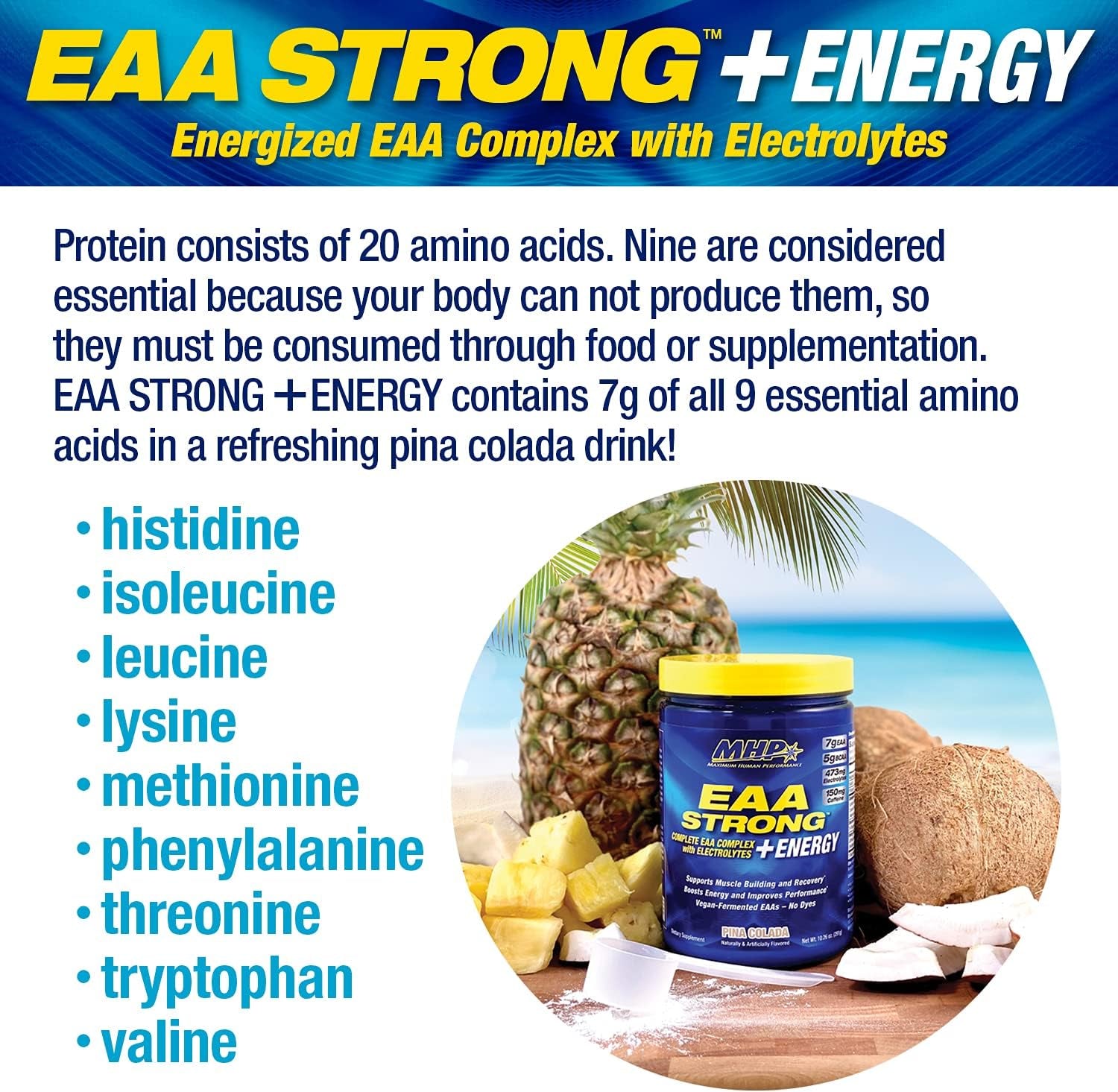 ENERGIZING ESSENTIAL AMINO ACID SUPPLEMENT: MHP’s EAA STRONG + ENERGY amino acid powder provides 7 grams of all nine essential amino acids, including 5g BCAA. These essential amino acids support muscle building and recovery and guard against muscle breakdown during training.* Plus, it provides natural energizers and electrolytes