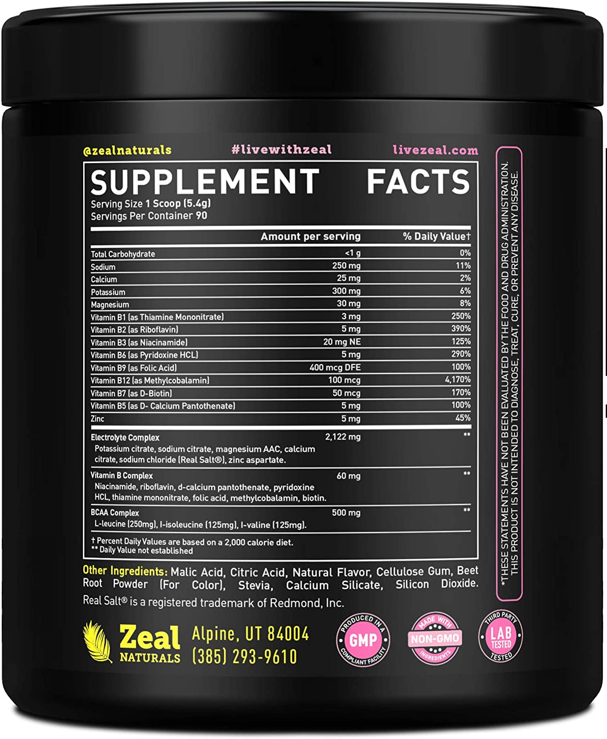 | Ingredients | Potassium Citrate, Sodium (Real Salt Powder), Sodium Citrate, Magnesium Amino Acid Chelate, Calcium Citrate, Zinc, L-Leucine, L-isoleucine, L-valine, Thiamine(B-1), Riboflavin(B-2), Niacin (B-3), Pantothenic Acid (B-5), Pyridoxine (B-6), Folate (B-9), Cobalamin (b-12), Biotin (B-7), Malic acid, citric acid, natural flavor, cellulose gum, beet root powder (for color), stevia, calcium silicate, silicon dioxide |