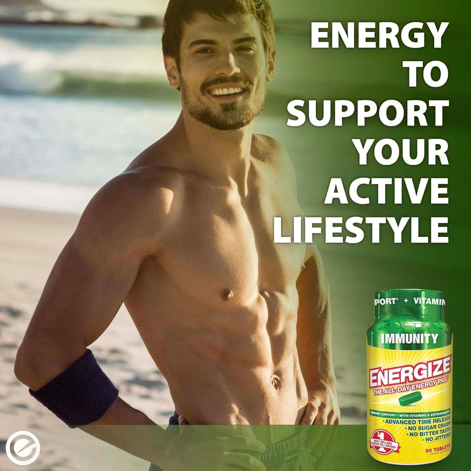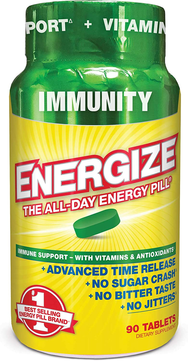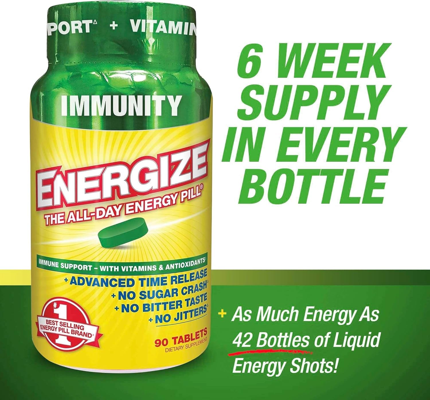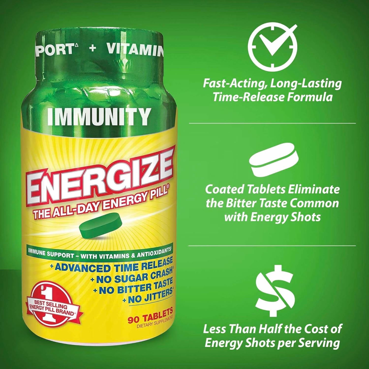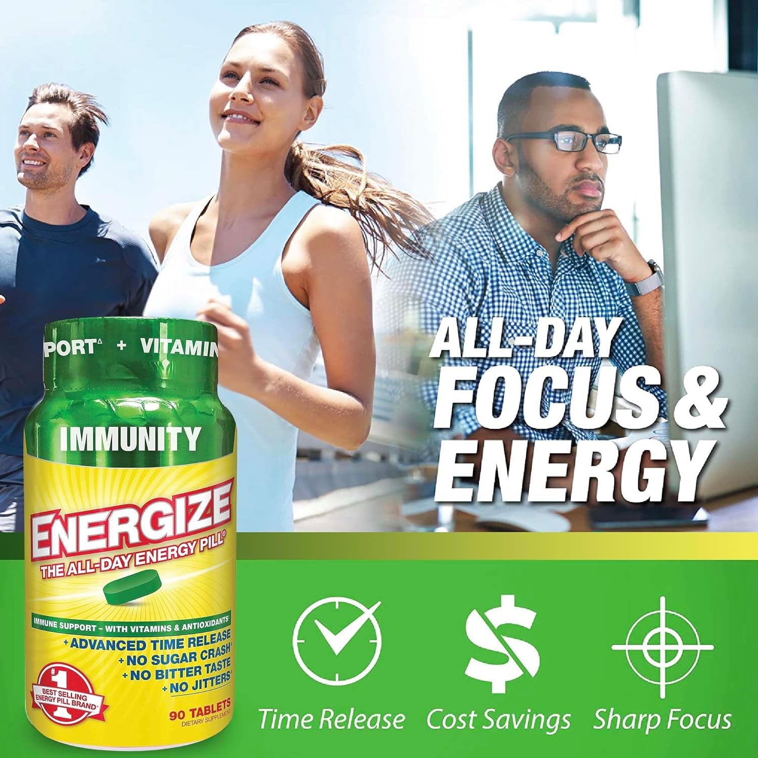 - All Day Energy Pills Plus Immune Support: Energize is the #1 Selling Energy Pill Brand according to Independent Retail Data. With its extended time-release caffeine formula, your energy and focus are sustained all day with no jitters or crash.