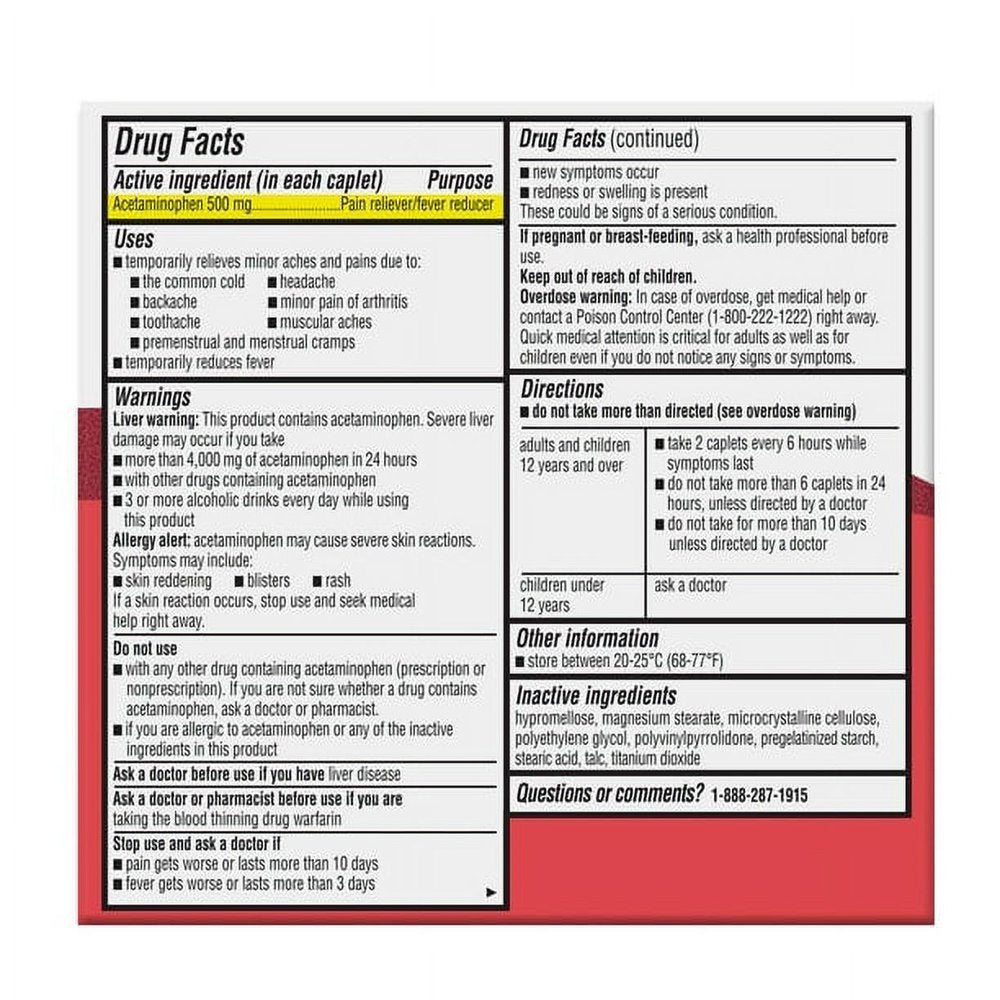 - Active ingredient (in each caplet): Acetaminophen 500 mg (pain reliever/fever reducer)