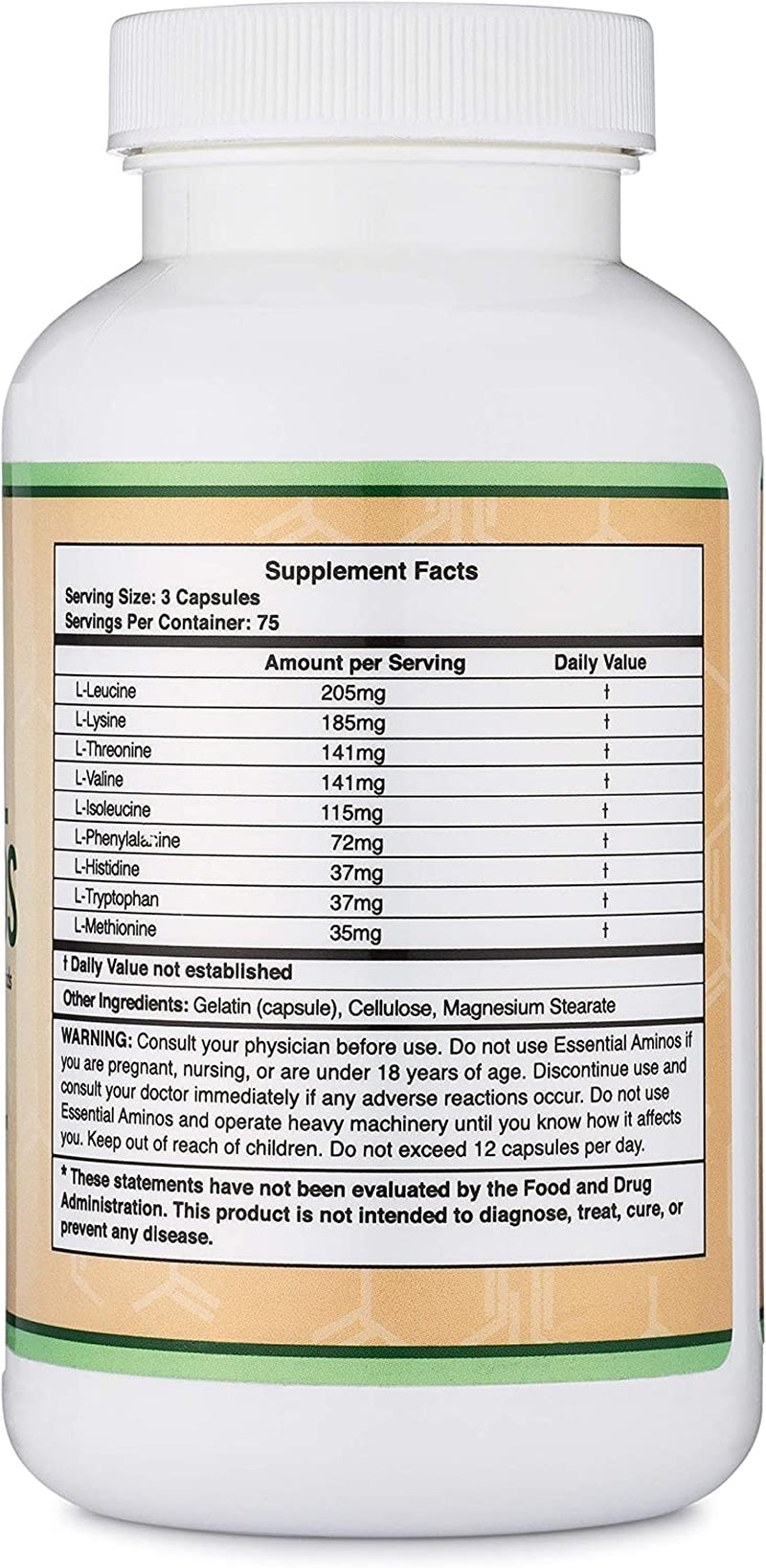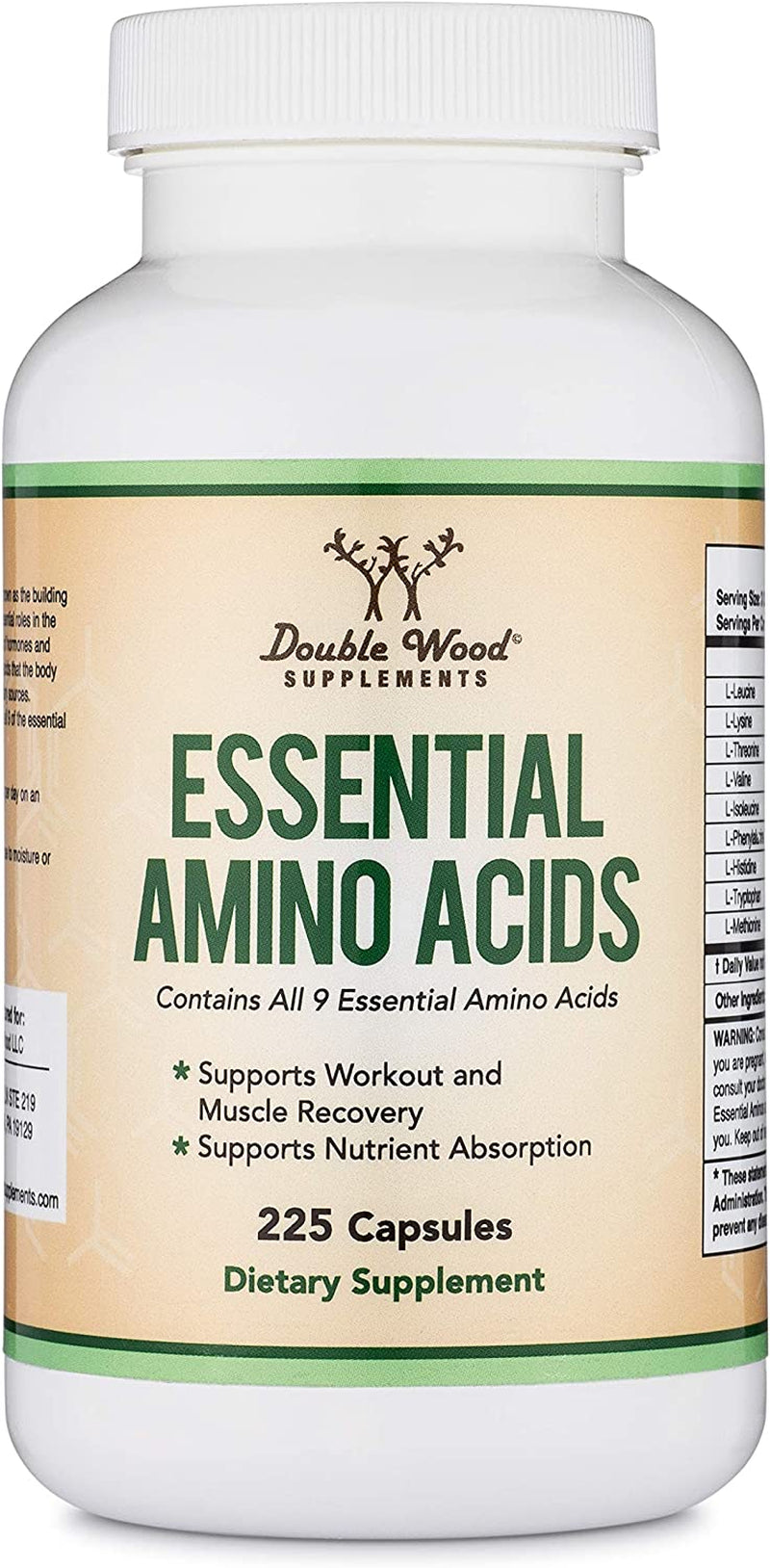 Essential Amino Acids - 1 Gram per Serving Powder Blend of All 9 Essential Aminos (EAA) and All Branched-Chain Aminos (Bcaas) (Leucine, Isoleucine, Valine) 225 Capsules by Double Wood Supplements