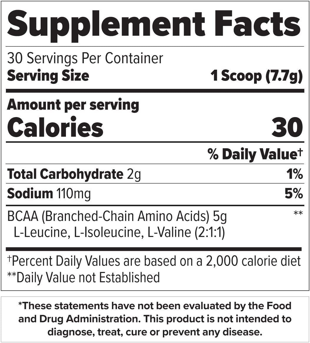 - 2:1:1 BCAAs - This formula is anchored by pure Branched-Chain Amino Acids (BCAAs) at the 2:1:1 ratio—2g of leucine for every 1g of isoleucine & valine—and free from fillers & unnecessary additives.