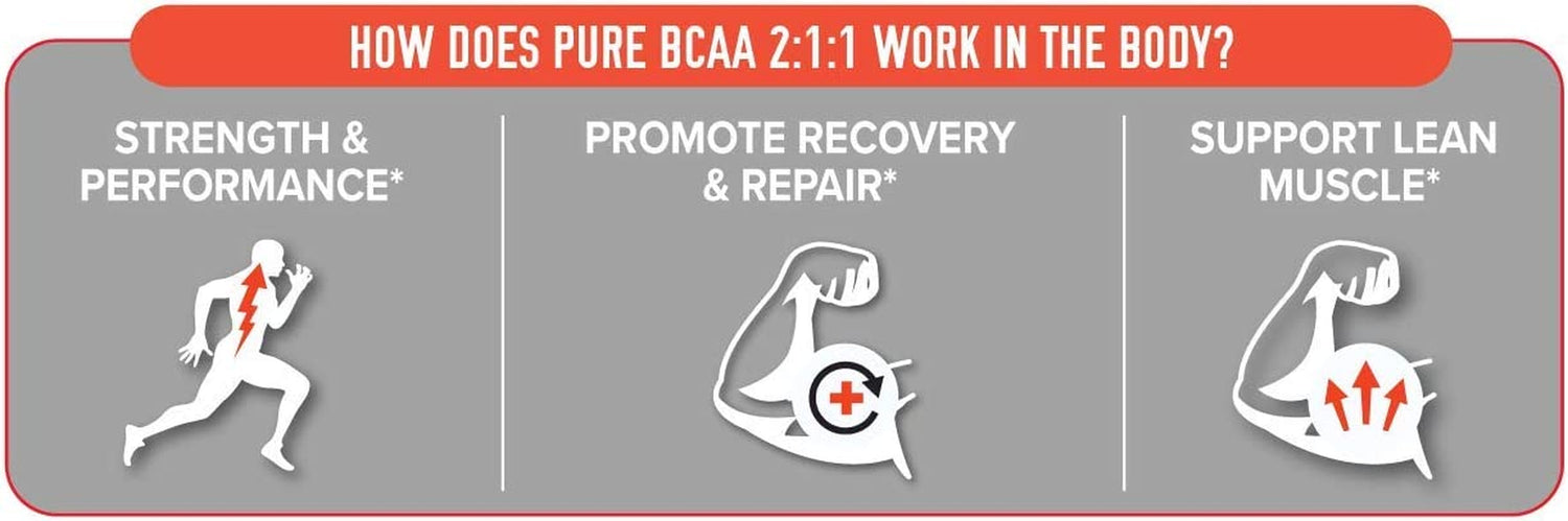 - INCREASE STRENGTH & PERFORMANCE - PURE BCAA 2:1:1 promotes strength, recovery & performance. Formulated for both men & women, it may help increase performance during workouts on the first dose!