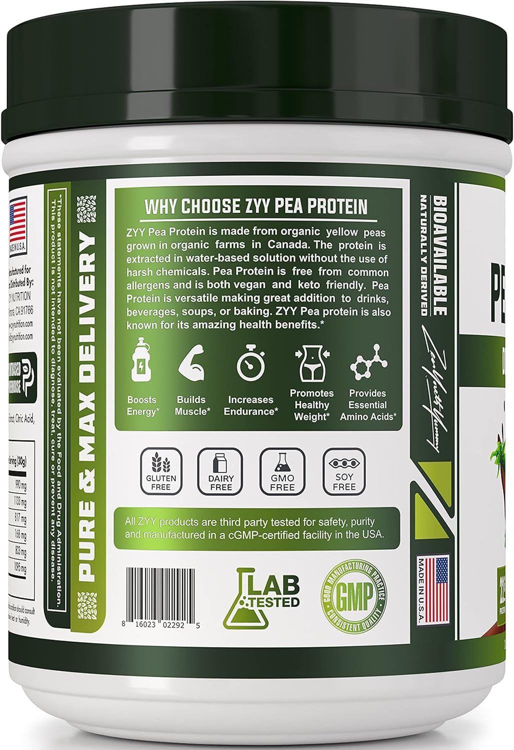 • HYDROLYZED ORGANIC PEA PROTEIN POWDER - Organic Pea Protein Powder extracted from raw yellow peas grown in Canada. ZYY Pea Protein is all natural plant based protein powder made with NO artificial flavors, coloring, or other ingredients. ZYY Pea Protein is hydrolyzed which eliminates the grainy texture commonly found in plant based protein powder and it is mix with cocoa powder which results in a very smooth, rich chocolate flavor tasting product.