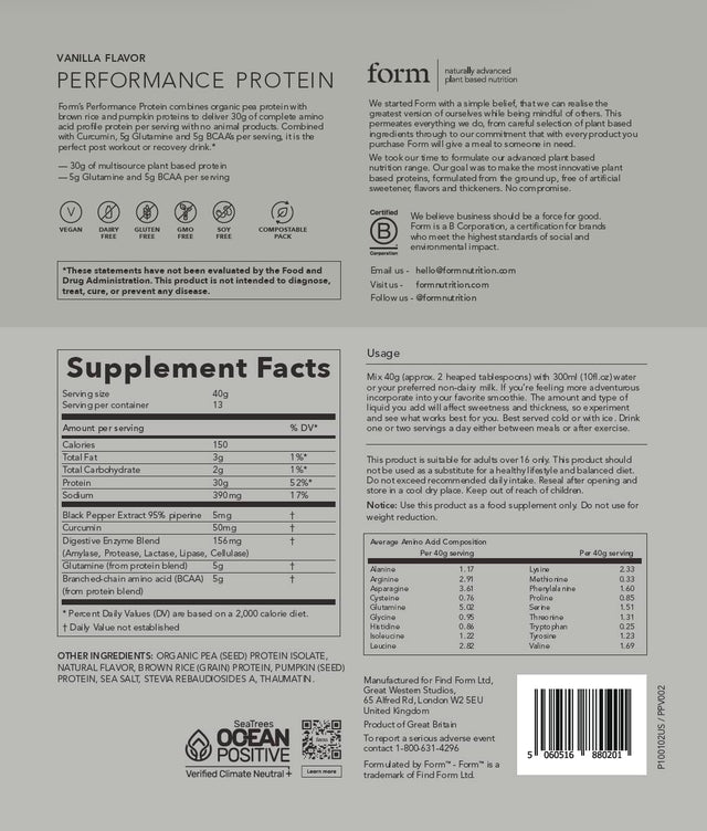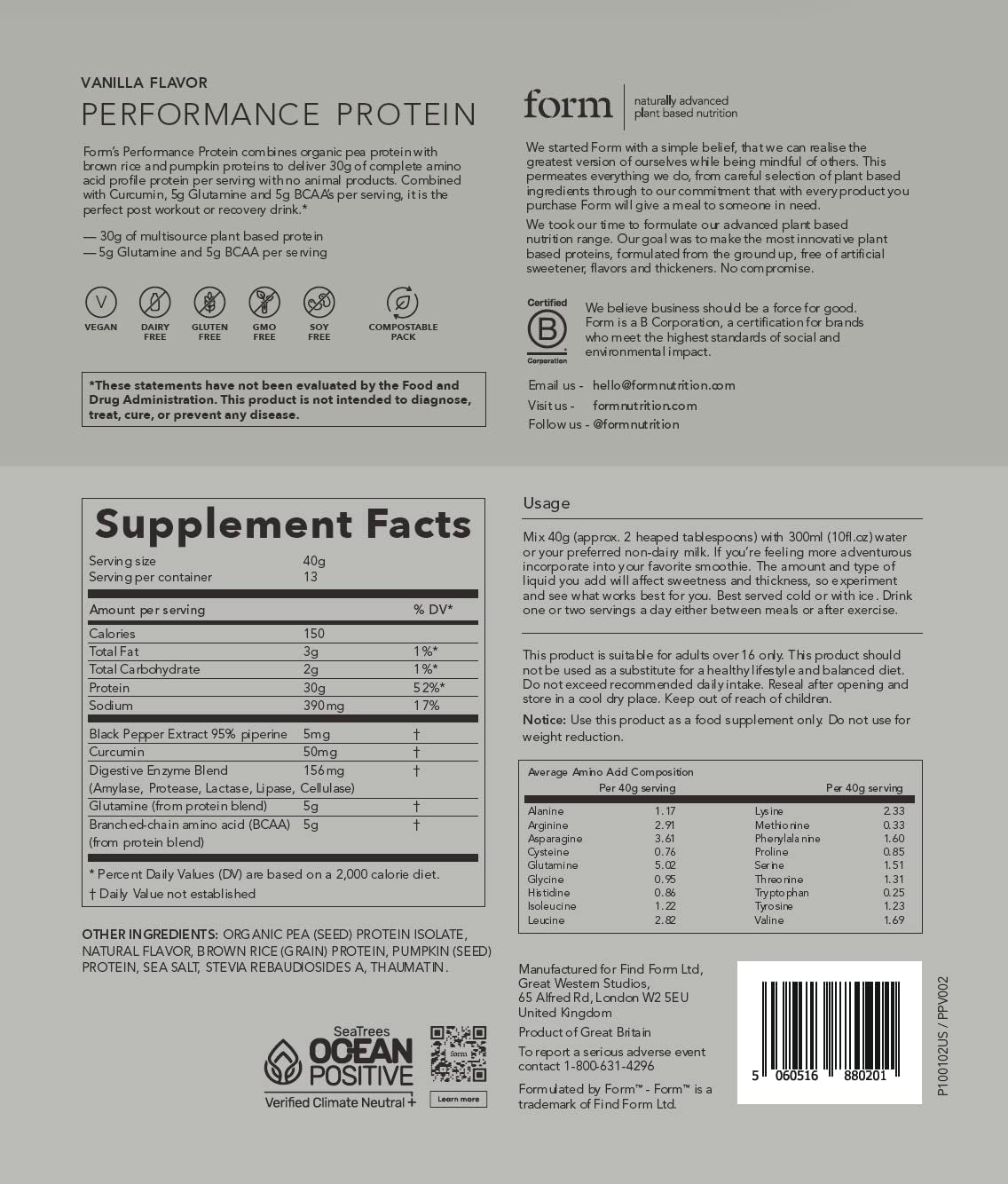 Form Performance Protein - Vegan Protein Powder - 30G of Plant Based Protein per Serving, with Bcaas and Digestive Enzymes. Perfect Post Workout. Tastes Great with Just Water! (Vanilla)