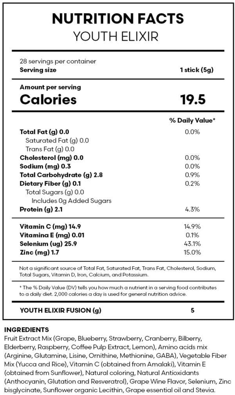 • YOUTH ELIXIR is a delicious anti-aging drink that combines ancestral knowledge from nature, the source different cultures resorted to, eager to extend their youth.