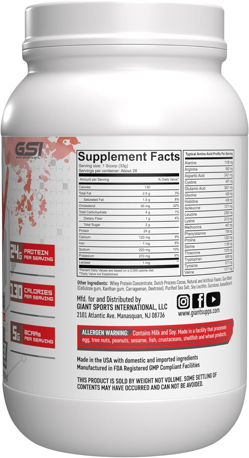 Giant Sports Whey Protein - Premium Protein Powder - 100% Whey, 24G Protein per Serving, 5G Bcaas - Chocolate 2 Pound