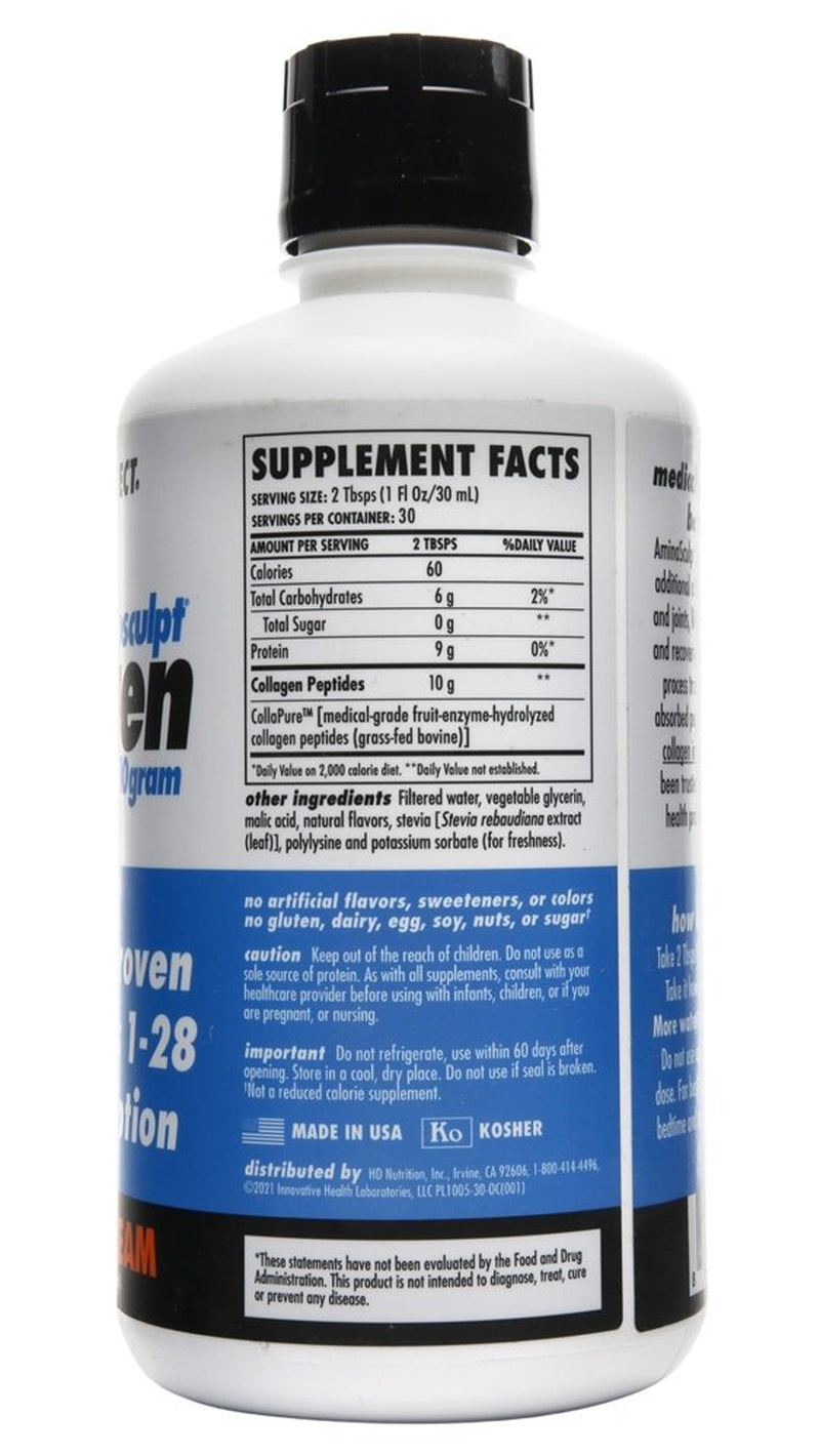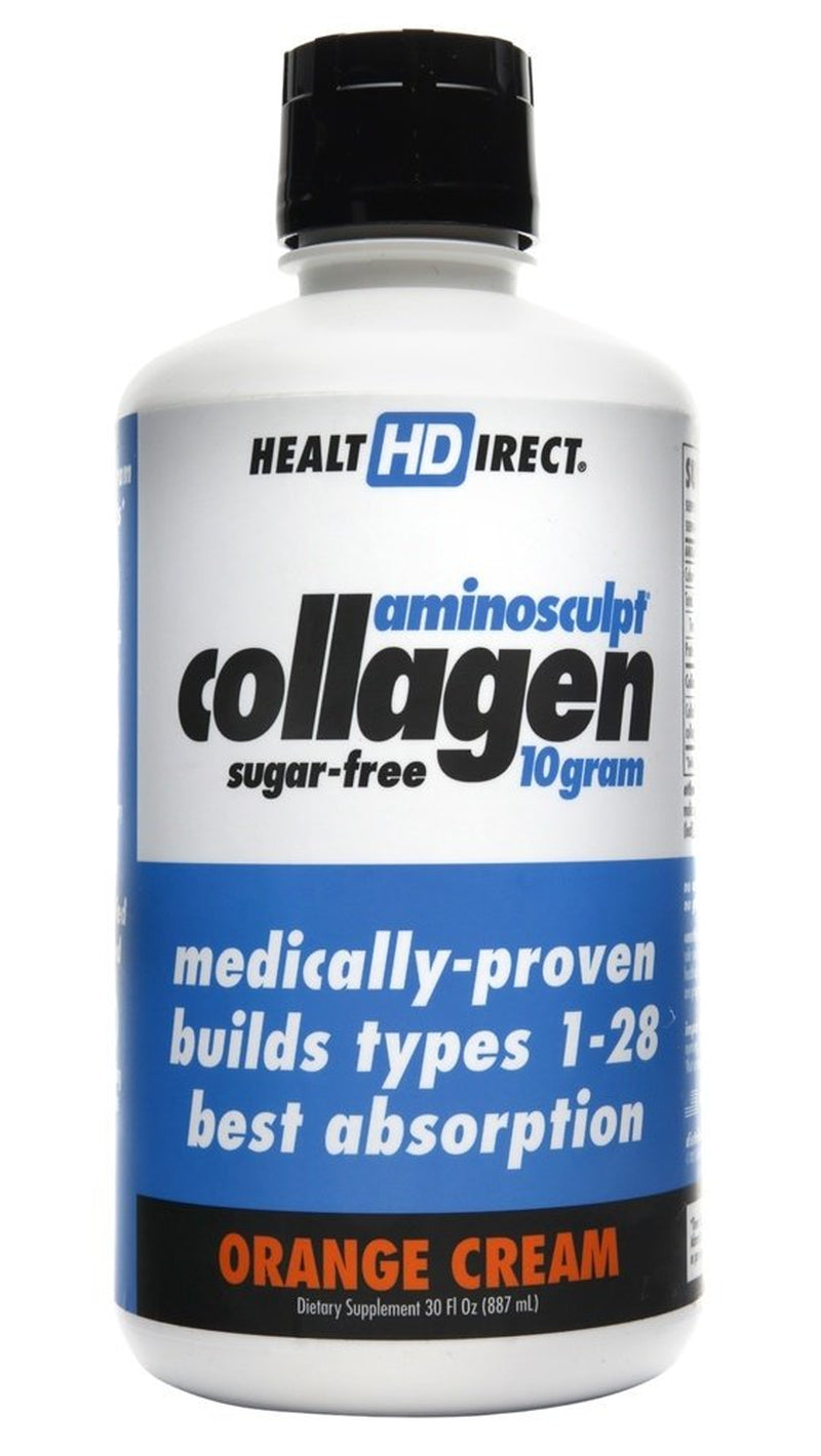 Health Direct - Aminosculpt Liquid Collagen Sugar-Free Orange Cream 10 g. - 30 fl. oz. (887 mL) Is your collagen medically-proven? Health Direct AminoSculpt’s Liquid Collagen protein is medical-grade. It is perfectly predigested into the smallest peptides for better absorption, by even the most sensitive gut. It is highly concentrated and ready-to-drink for your busy life. These "whole body" peptides build all 28 types of collagen in the body including types I, II, III, IV, V, and X.