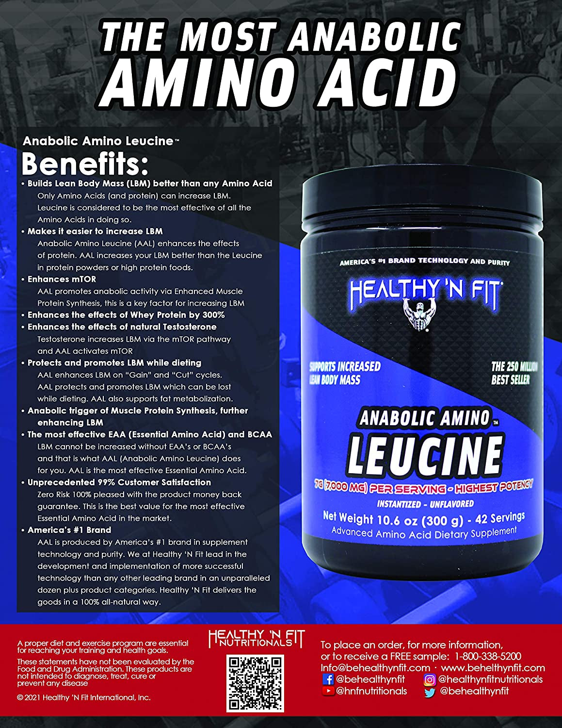 A. HEALTHY 'N FIT – Advisors to World-Class Prep Coaches, Bodybuilders, Athletes and Celebrities, and America's #1 Brand in Supplements Technology and Purity, developing and implementing more successful technology than any brand, in an unprecedented dozen plus product categories under the HEALTHY 'N FIT brand and for other leading brands. HEALTHY 'N FIT Supplements Incorporate Clinically Dosed and Tested Key Ingredients, utilizing Meta-Analytical Sciences and Truly Pure technology – exclusive to HEALTHY 'N FIT. HEALTHY 'N FIT ANABOLIC AMINO LEUCINE is 100 percent pure, with zero fillers and no artificial ingredients.