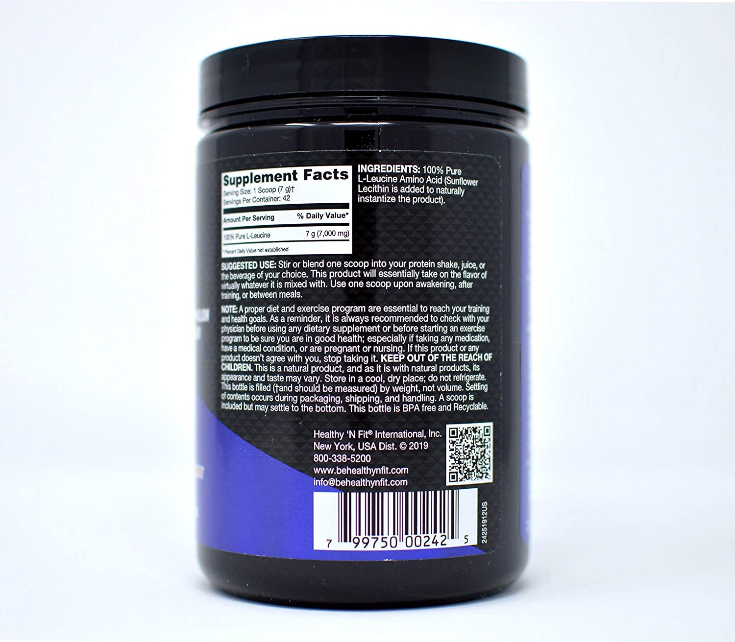 7g (7,000 mg) per serving High Potency 100% Pure Leucine. Instant and unflavored.