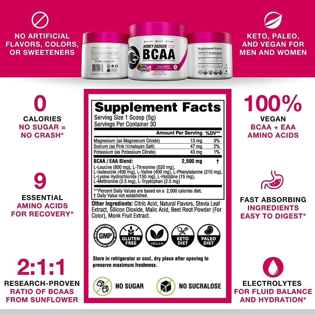 Honey Badger Pre Workout Powder & BCAA Amino Acids Powder Bundle | Beta Alanine, Caffeine & Vitamin C + Electrolytes | Vegan Keto Sugar Free & Paleo for Men & Women | 30 Servings (Wild Berry) is backordered and will ship as soon as it is back in stock.