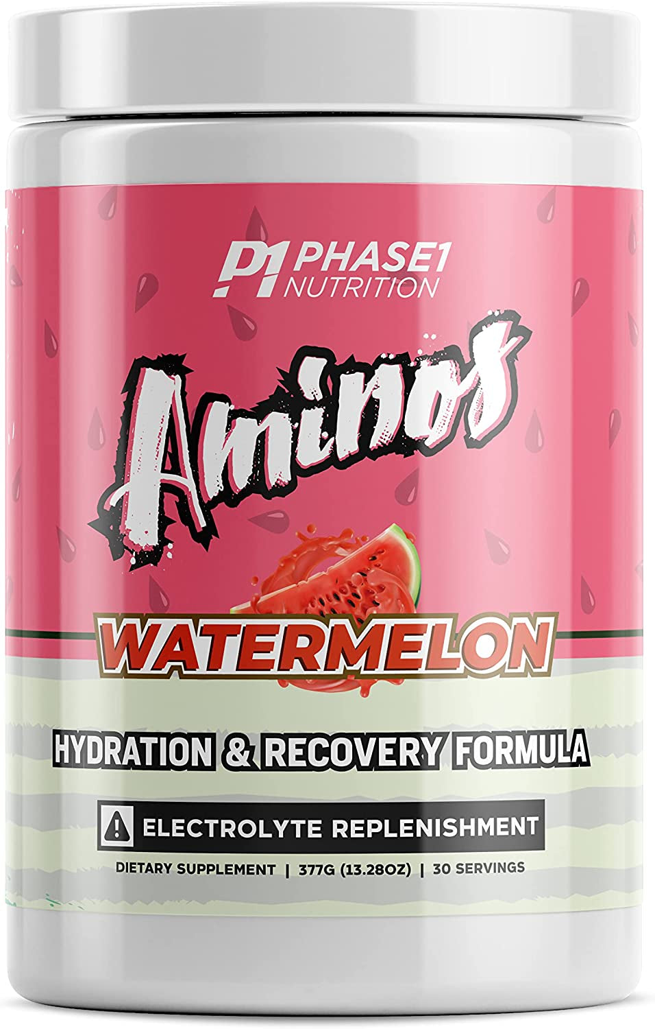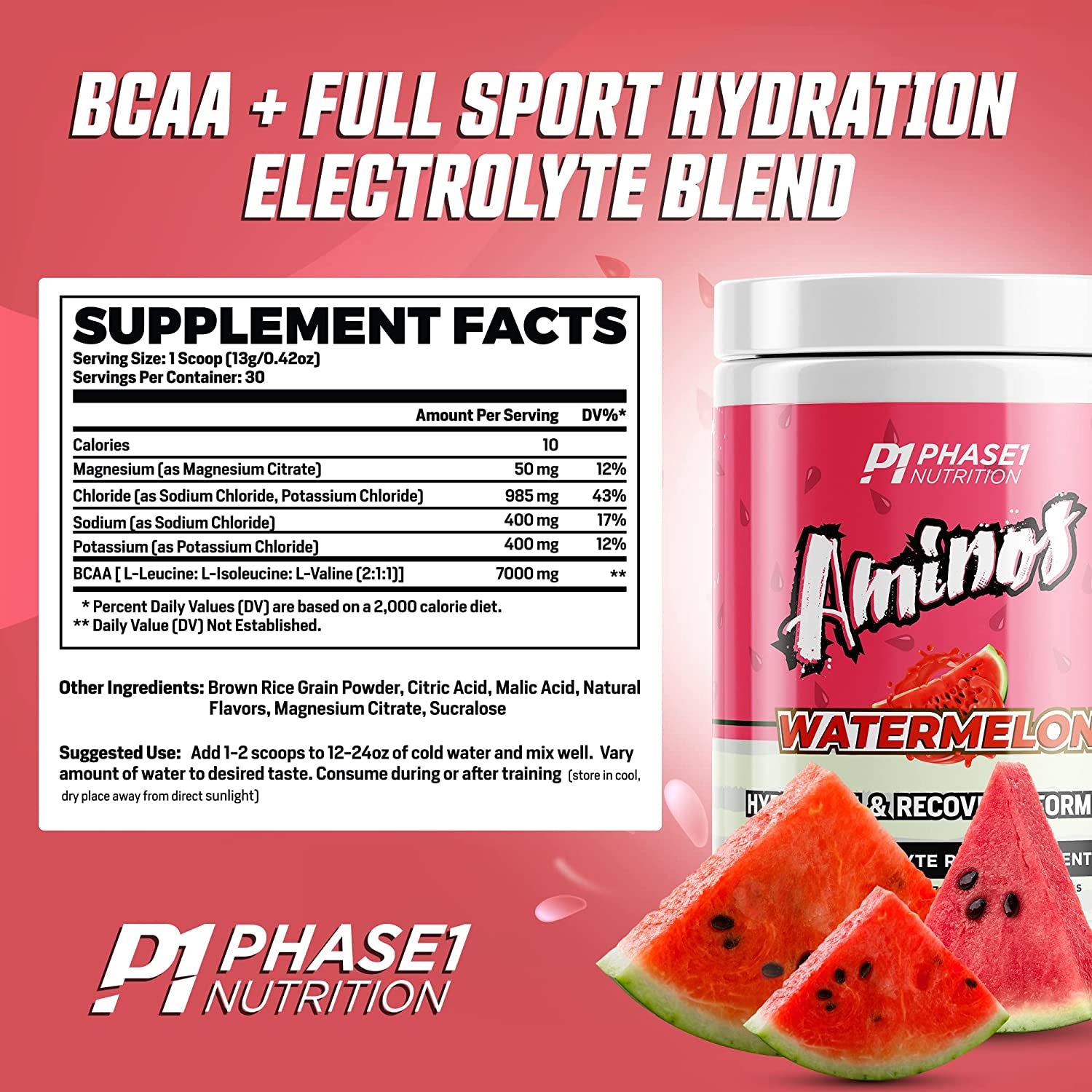 Hydration Aminos Supplement for Muscle Recovery Protein Synthesis Boost - Watermelon - Phase 1 Nutrition BCAA + Electrolyte Blend - Branched Chain Amino Acids for Inter and Post Workout