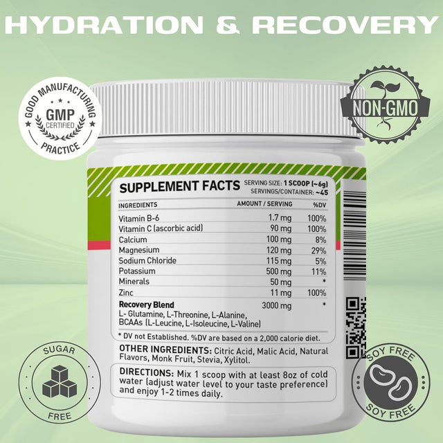 - Ingredients: Vitamin B-6, Vitamin C, Calcium, Magnesium, Sodium Chloride, Potassium, Minerals, Zinc, L-Glutamine, L-Threonine, L-Alanine, L-Leucine, L-Isoleucine, L-Valine (BCAA s). OTHER INGREDIENTS: Citric Acid, Malic Acid, Natural Flavors, Monk Fruit, Stevia, Xylitol.