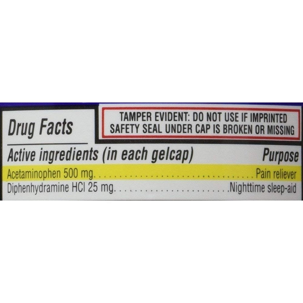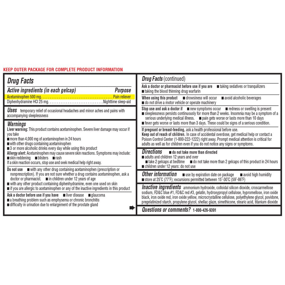 - Each gelcap contains 500mg of Acetaminophen and 25mg of Diphenhydramine HCl