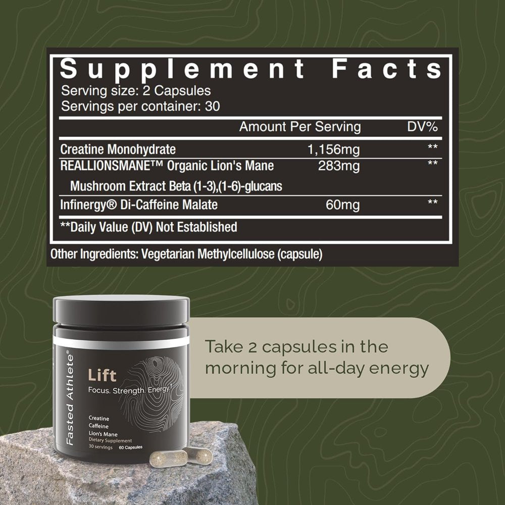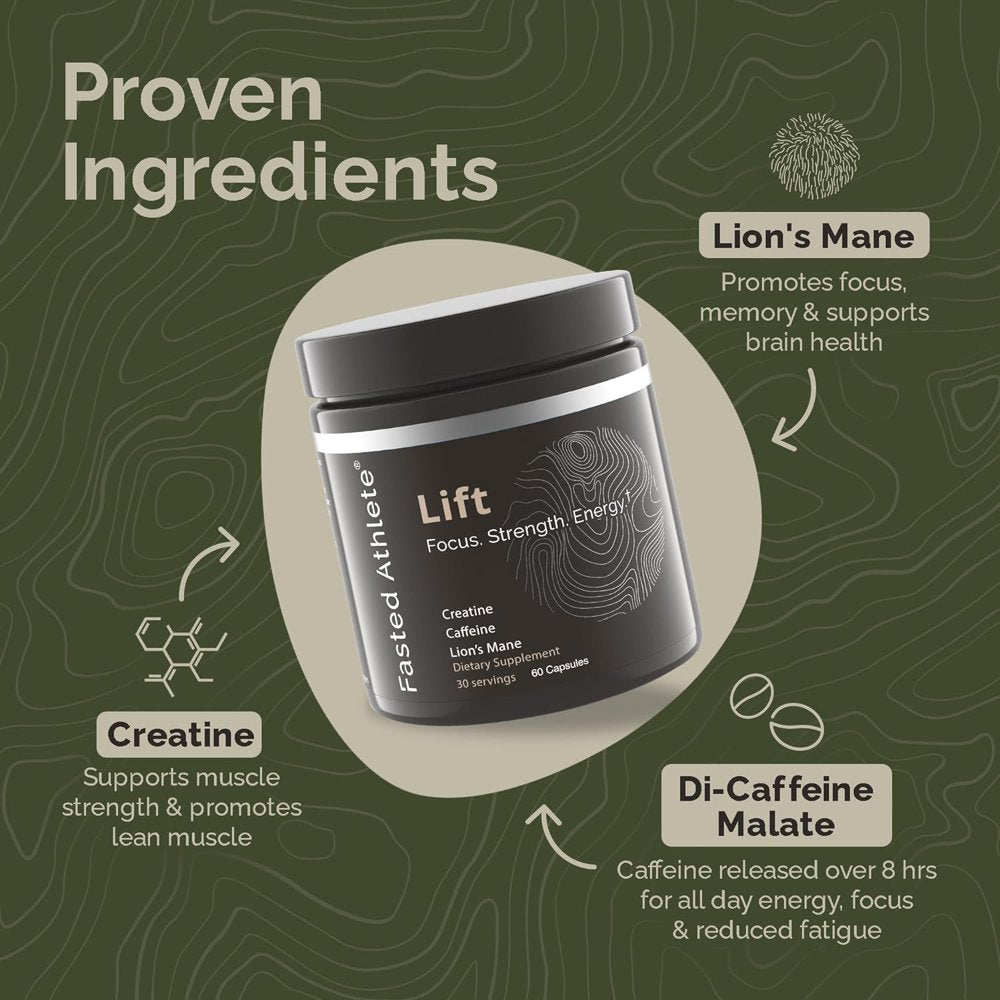 Fasted Athlete's mission is to build stronger, healthier individuals so they can support those around them. We created Lift, a daily energy and focus supplement that boosts energy on a cellular level. Lift contains functional mushrooms, creatine, and time-release caffeine in a convenient capsule. If you are tired of getting tired in the afternoon, this potent nootropics brain support supplement with creatine and caffeine is for you. One supplement to support all your daily activities. Our unique formula includes organic lion's mane mushroom for mental focus, creatine monohydrate for strength in the gym, and di-caffeine malate for sustained energy. Eliminate the need for expensive energy drinks and switch to Lift. Lift lions mane supplement with creatine can be used preworkout and post workout. Creatine monohydrate pills can help provide brain energy as well as physical endurance. If you're looking for energy supplements for men or women, these workout supplements are ideal for all adults. Our creatine for women and men will keep you going all day in the office, at the gym and on casual days off. For less than the price of a cup of coffee, Lift fuels your brain and muscles so you can power through your day. Fasted Athlete Pledge - We are confident you will love our products. If you don't feel a positive change in the first 30 days, we will gladly refund your purchase. *These statements have not been evaluated by the Food and Drug Association. This product is not intended to diagnose, treat, cure, or prevent any disease.