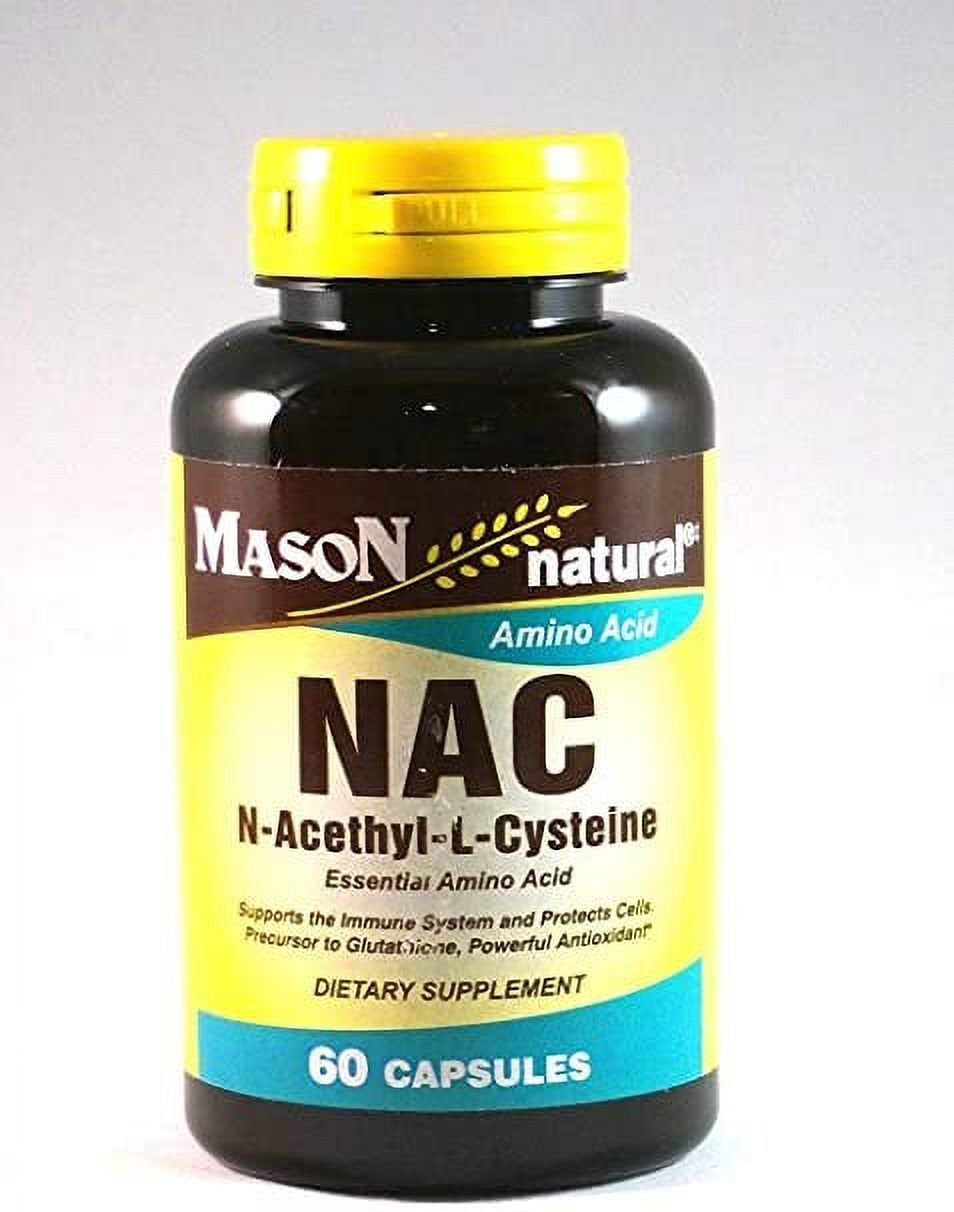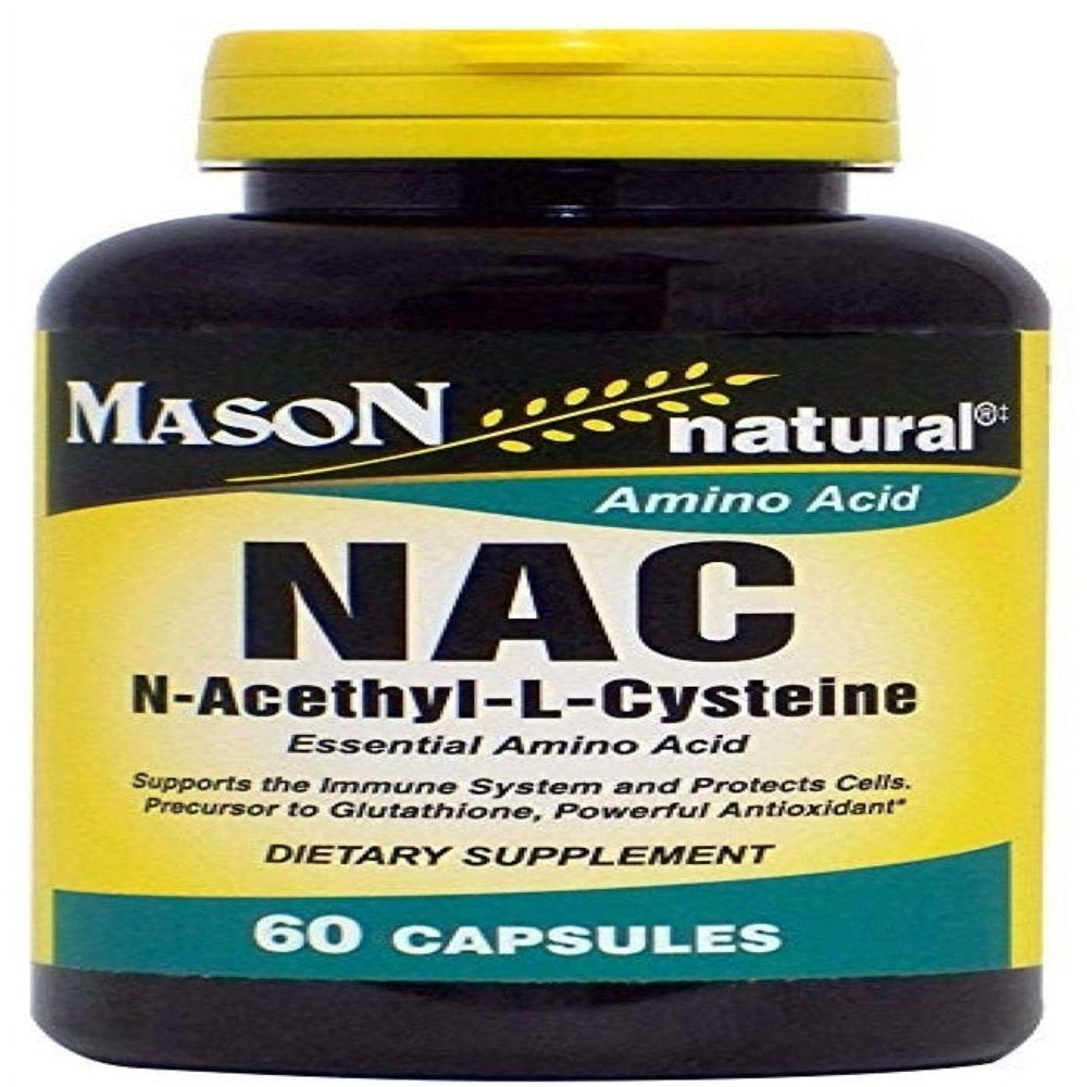 6 Pack Mason Natural NAC N-Acethyl-L-Cysteine Essential Amino Acids 60 ct.Essential amino acid. Supports the immune system and protects cells. Precursor to glutathione, powerful antioxidant.Guaranteed no added: sugar, starch, wheat, corn, fish, shellfish, peanuts, tree nuts, soy, yeast, artificial flavors and colors, dairy, egg, fragrance and preservatives. Sodium free.This statement has not been evaluated by the Food and Drug Administration. This product is not intended to diagnose, treat, cure or prevent any disease.Ingredients: Gelatin, cellulose, magnesium stearate, silica.Allergen Certification: - Many contain gluten.Guaranteed No Added: sugar, starch, wheat, corn, fish, shellfish, peanuts, tree nuts, soy, yeast, artificial flavors and colors, dairy, egg, fragrance and preservatives.ESSENTIAL AMINO ACIDS: Amino acids are important for overall health & wellness. This Mason Natural dietary supplement contains an essential amino acid that may support the immune system & may protect cells.