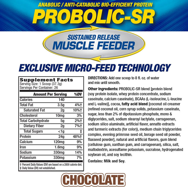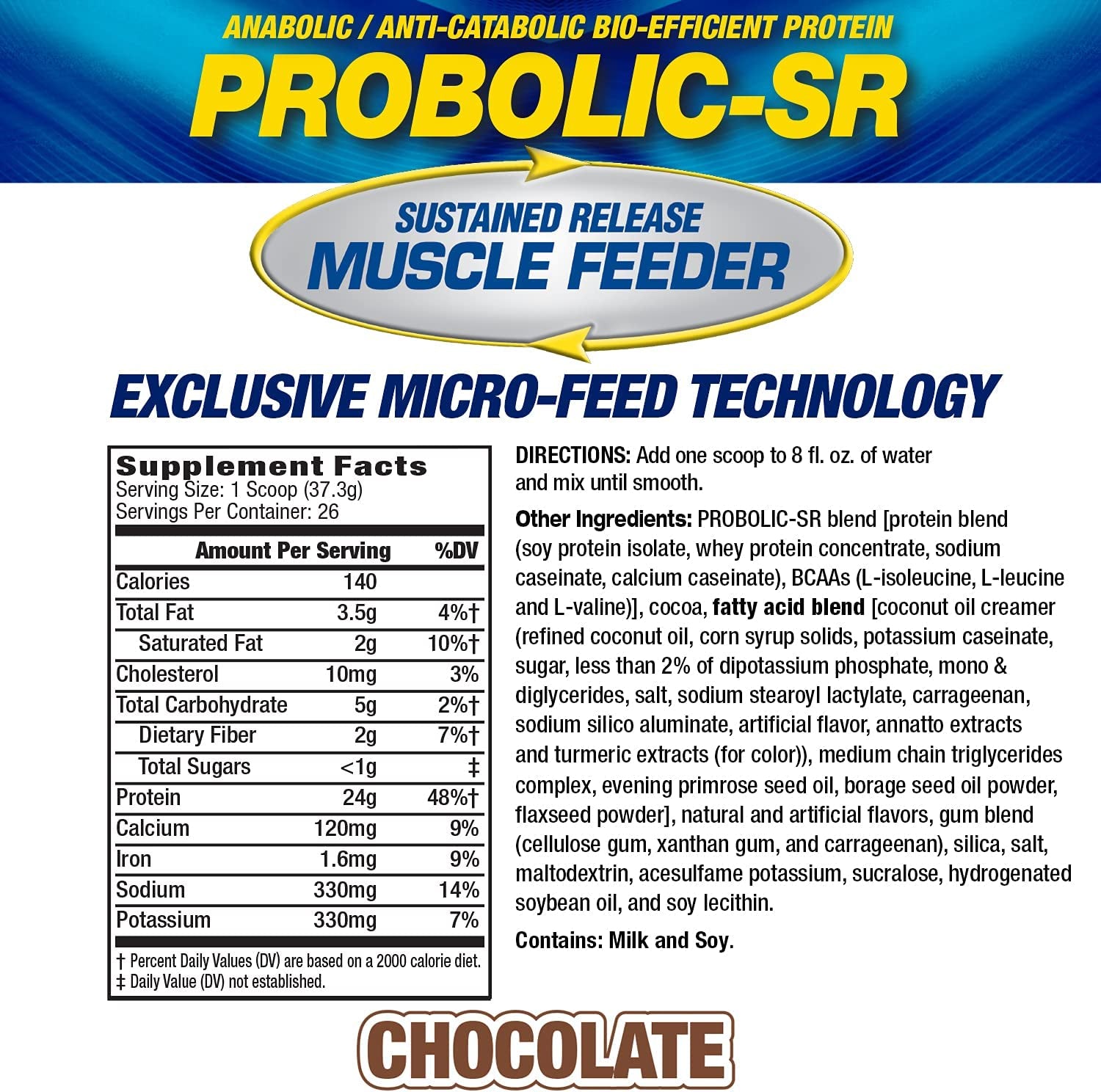 PROBOLIC-SR’s research proven protein blend of whey, soy and casein combined with its exclusive sustained release micro-coating technology makes it a superior muscle building protein supplement. PROBOLIC-SR’s protein sources and Microfeed Technology are designed to deliver a continual supply of high levels of critical amino acids to stimulate muscle growth, prevent muscle loss and speed recovery. PROBOLIC-SR’s multi-phase release and steady supply of amino acids makes it the ideal “anytime” protein. The fast-acting whey and long-lasting protein sources make it perfect for post-workout as it quickly and continually supplies amino acids. It’s also perfect to take in between meals to ensure you maintain adequate amino acids to decrease catabolic muscle breakdown and support muscle building. The Exclusive Sustained Release Micro-Feed Technology coating matrix used in PROBOLIC-SR further extends the supply of amino acids beyond 6 hours making the perfect nighttime protein. This controlled sustained release of amino acids to your muscles creates the ideal anabolic/anti-catabolic state for maximum muscle growth. Feed your hungry muscles with the most anabolic/anti-catabolic protein in existence, PROBOLIC-SR.