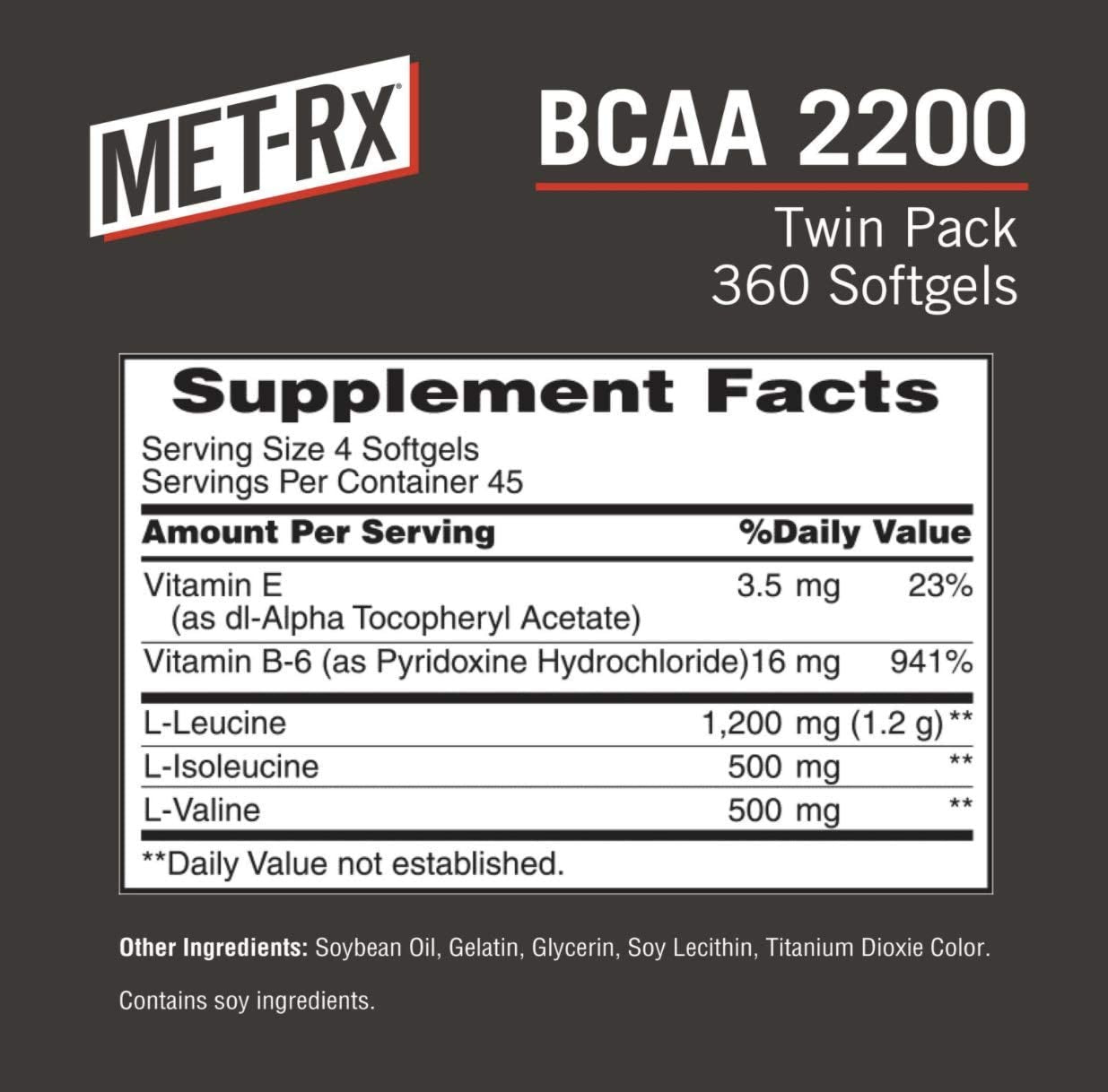 Met-Rx BCAA 2200 Amino Acid Supplement, Supports Muscle Recovery, 180 Softgels, 2 Pack (360 Total Count)