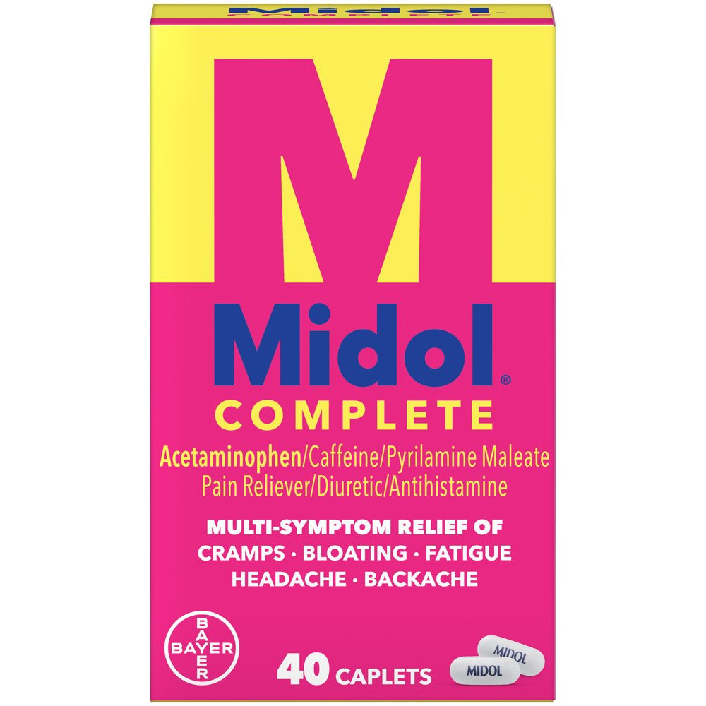 - Midol Complete Menstrual Pain Relief/Headache Relief Caplets w/ Acetaminophen - 40 Ct: One box of 40 count Midol Complete Menstrual Pain Relief Caplets with Acetaminophen, Caffeine and Pyrilamine Maleate