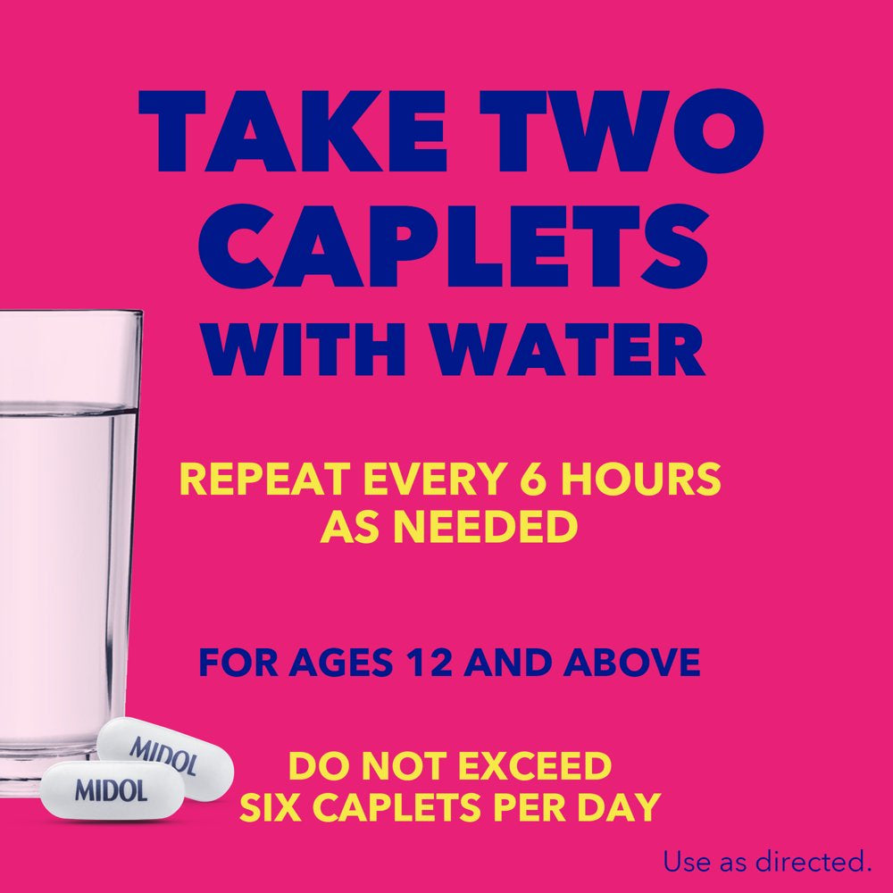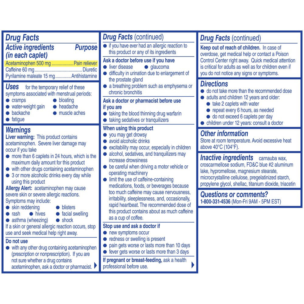 Midol Complete Menstrual Pain Relief Caplets with Acetaminophen provide up to six hours of PMS, period cramps, and headache relief to help you feel better and stay active during and right before your menstrual cycle. Available in convenient and easy to take caplets, Midol Complete contains acetaminophen with caffeine and pyrilamine maleate, combining a pain reliever, diuretic and antihistamine to effectively relieve period cramps, headache, backache, muscle ache, bloating, fatigue and water weight gain. These powerful menstrual cramp relief caplets are recommended for adults and children 12 years and older. Use as directed. Take two caplets with water and repeat every six hours as needed, but don't take more than six caplets a day.