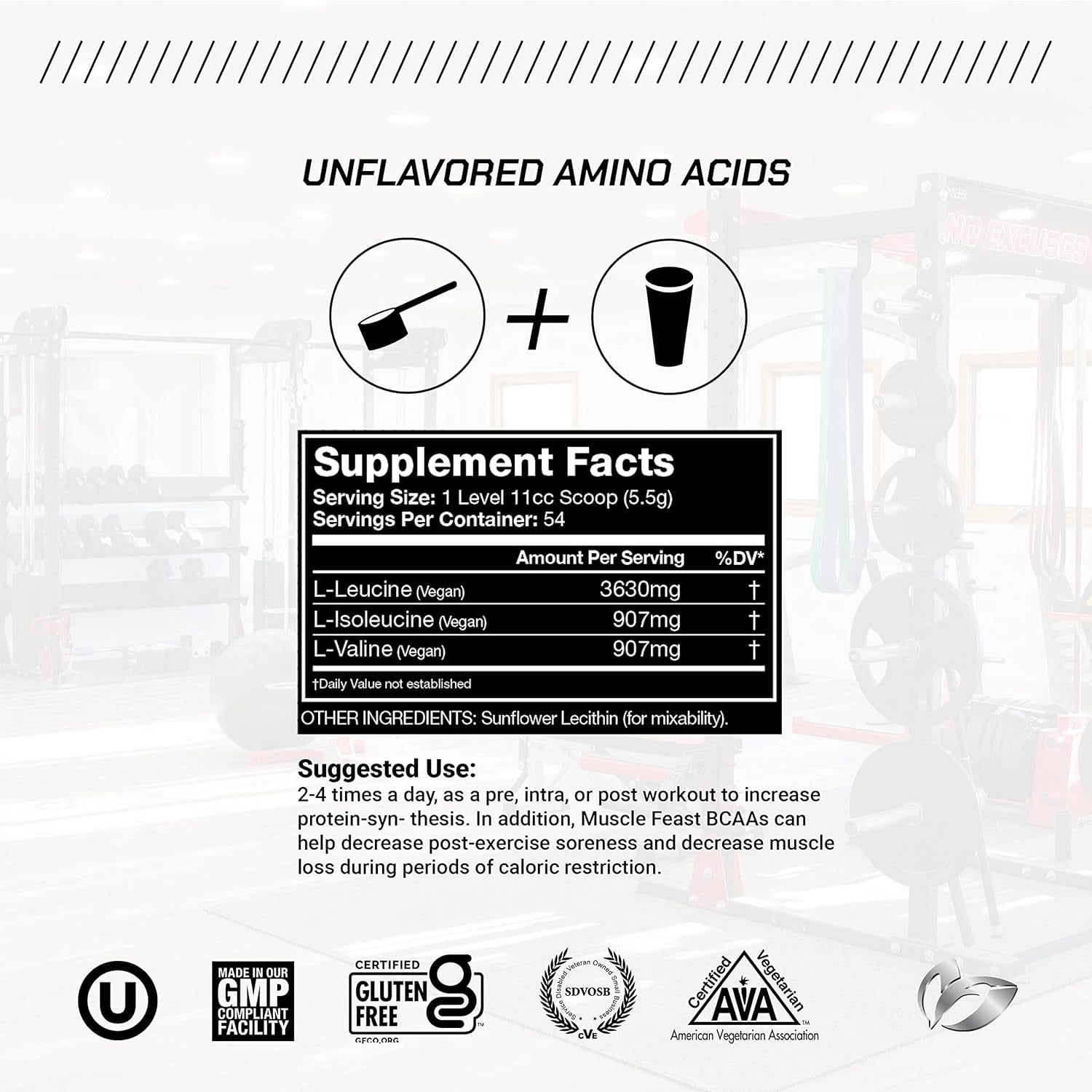 Muscle Feast BCAA 4:1:1 are instantized for optimal mixability and absorption. They can be taken 2-4 times a day, as a pre, intra, or post workout to increase protein-synthesis. In addition, Muscle Feast BCAAs can help decrease post-exercise soreness and decrease muscle loss during periods of caloric restriction.